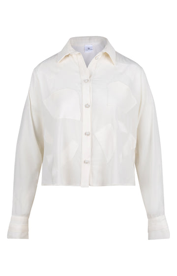This cream cropped shirt, crafted from a luxurious blend of 97% silk and 3% elastane,...