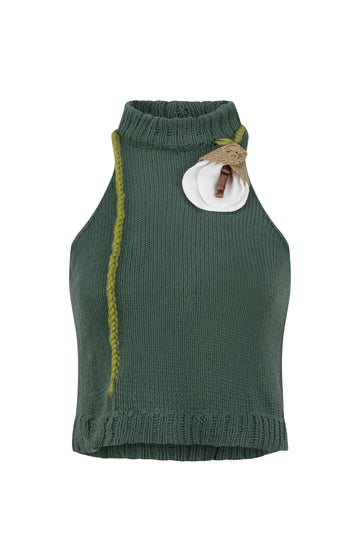 Introducing our luxurious green sleeveless turtleneck top, a refined blend of timeless elegance and artistic...