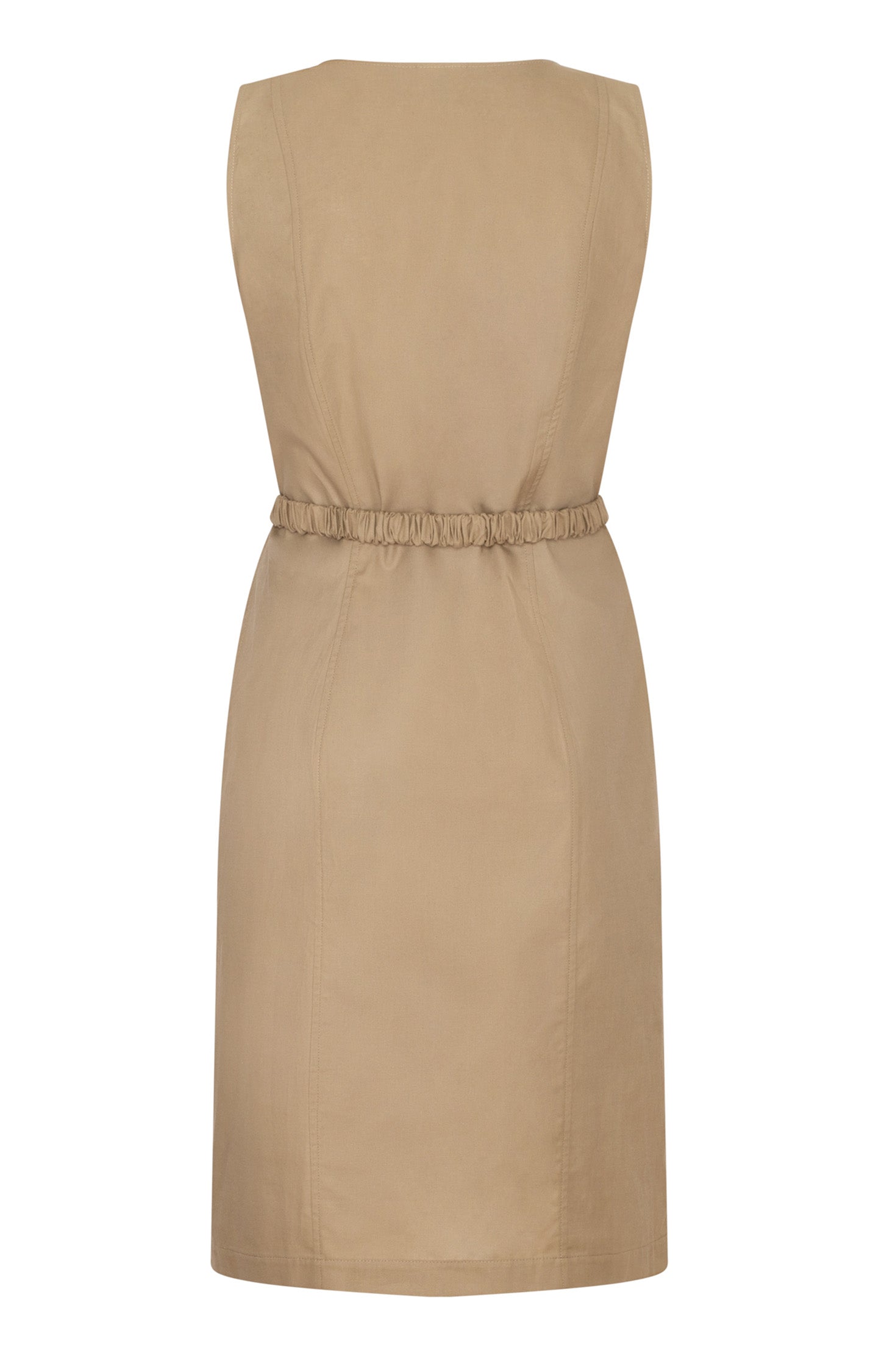 Minimalist and polished, this beige cotton dress is crafted from smooth, breathable cotton for lightweight comfort and a clean, modern look. Cut in a slim silhouette, it gently contours the body while a ruched elastic belt defines the waistline, creating a flattering, feminine shape.