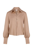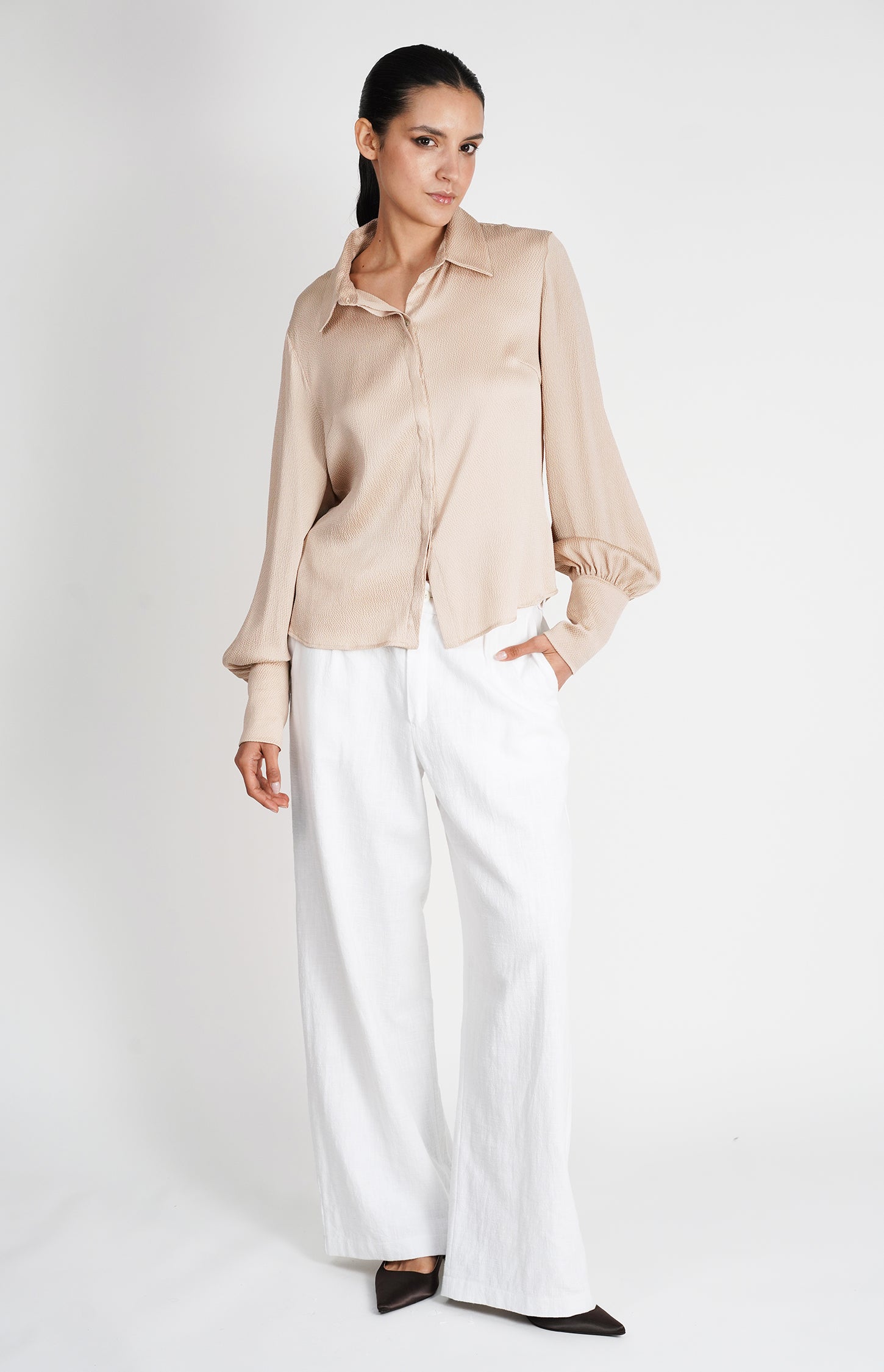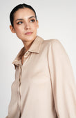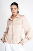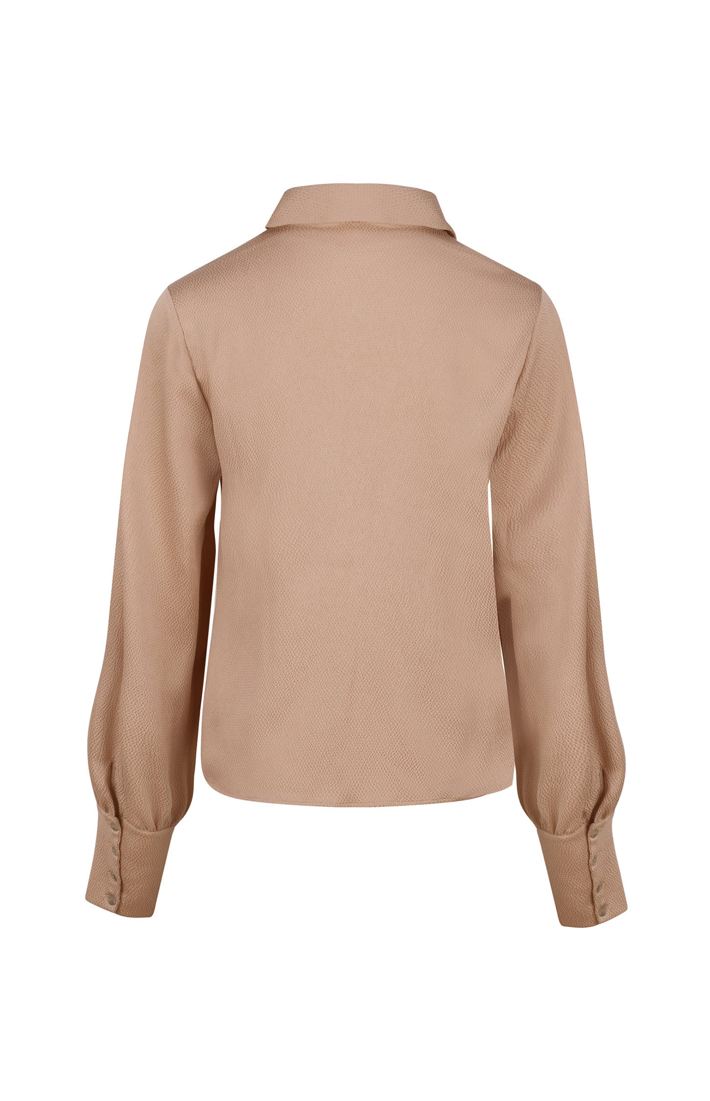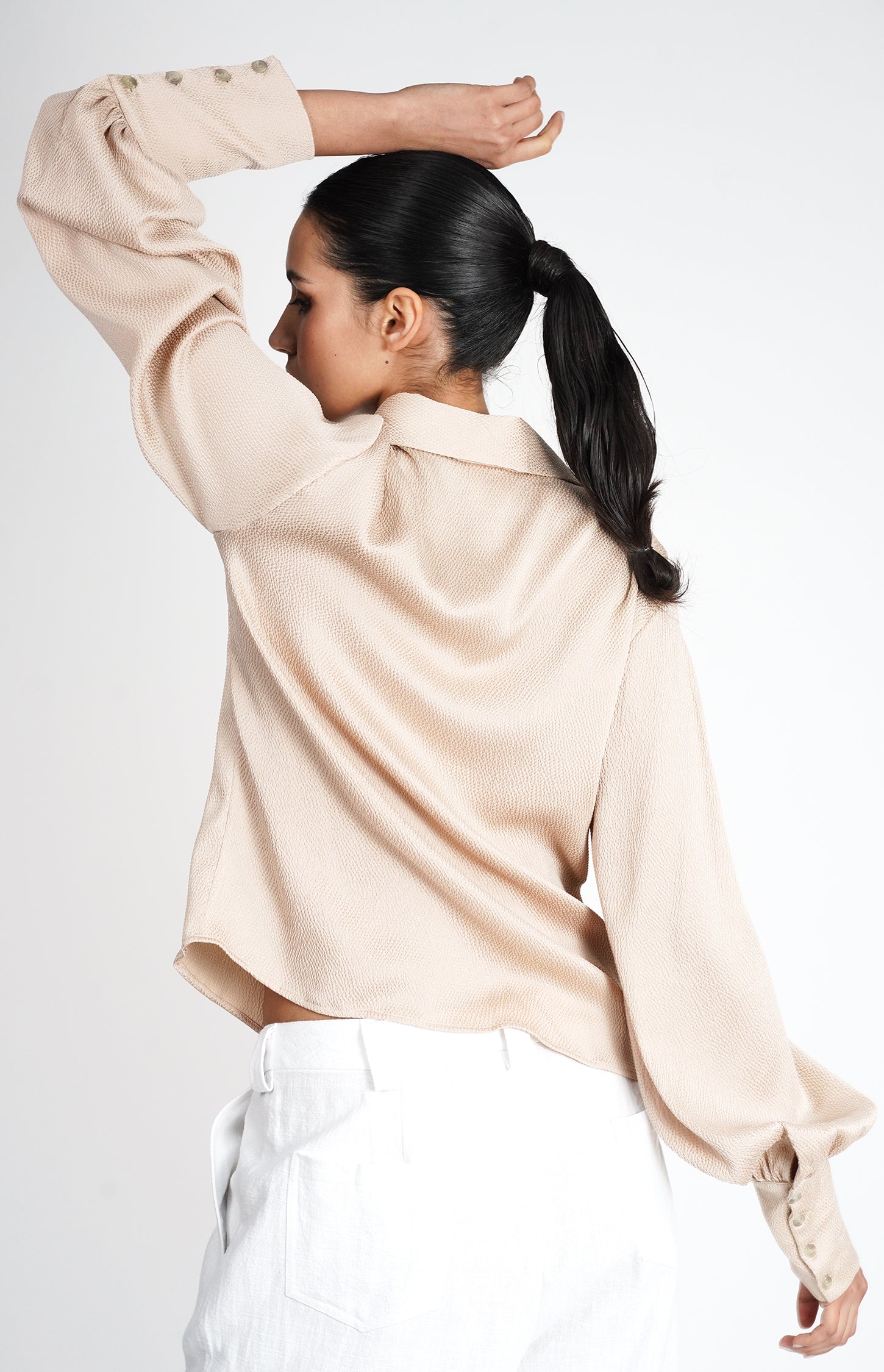 Introducing our soft beige Hammered Silk Shirt, a luxurious and versatile addition to your wardrobe. Crafted from exquisite slightly stretchy material, this shirt features long cuffs, a soft collar, and a figure-complimenting silhouette.