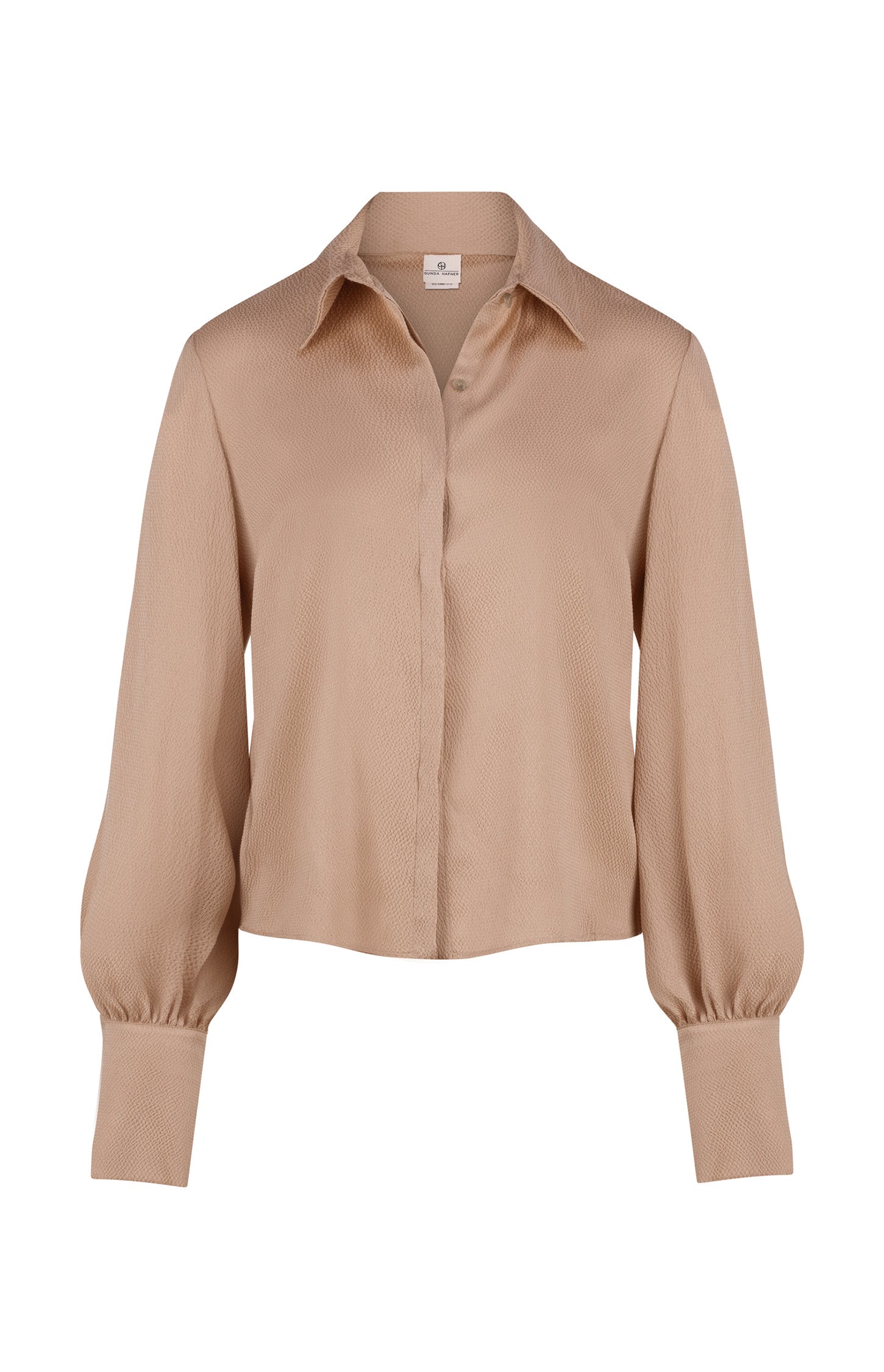 The soft hue and wide collar add an elegant touch, while the concealed buttons to the front provide a subtle yet stylish detail. Wide cuffs create a unique twist on the classic everyday shirt, adding a touch of sophistication to any outfit.