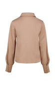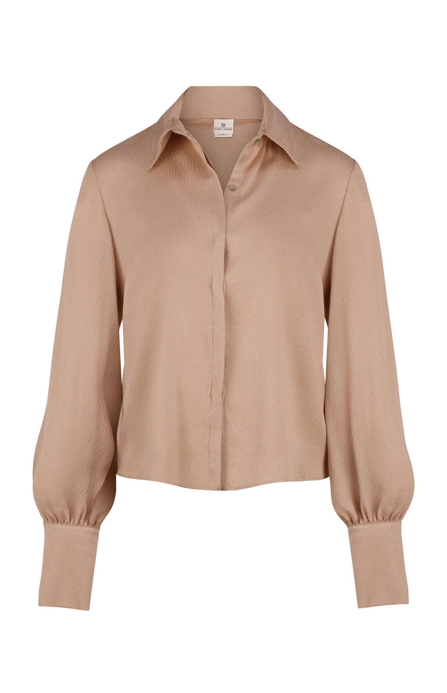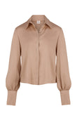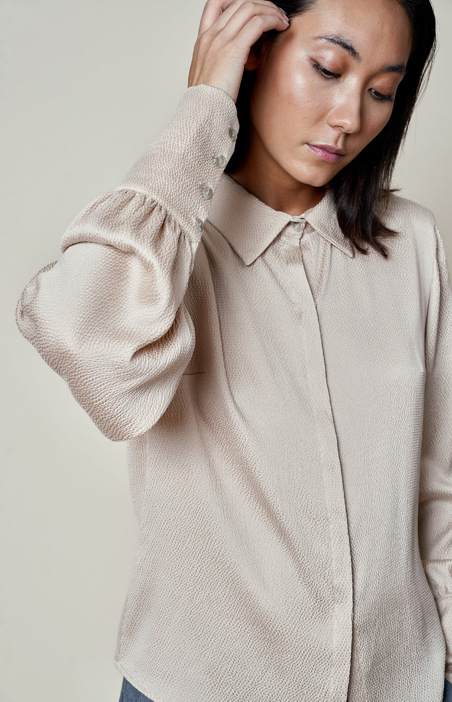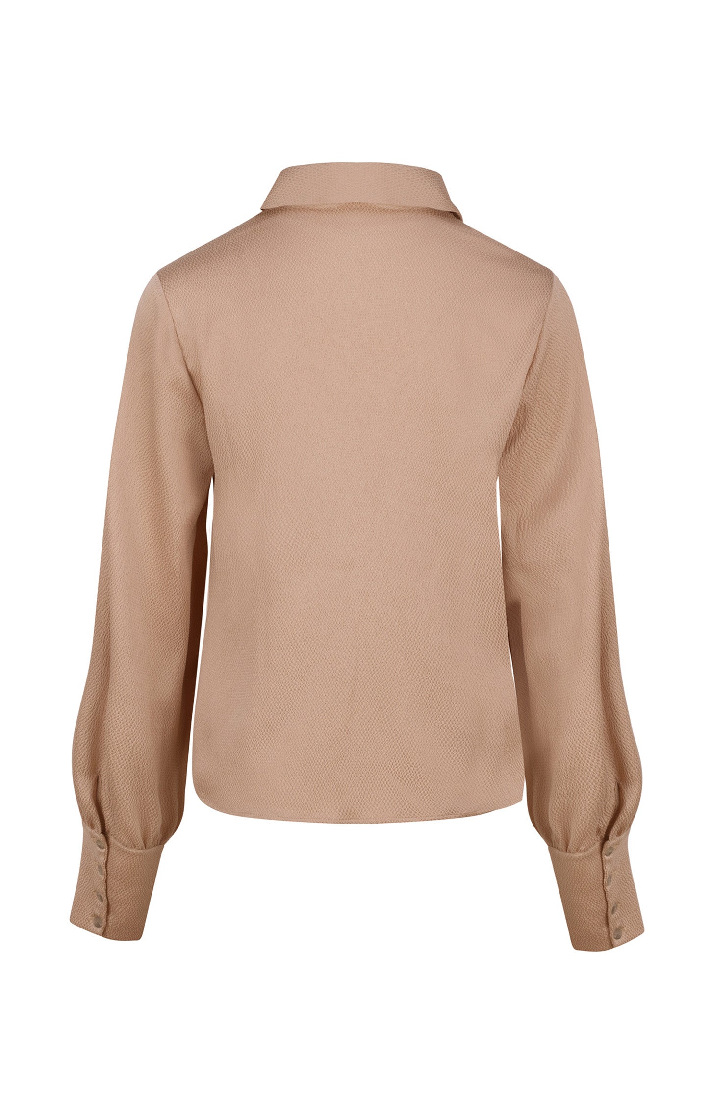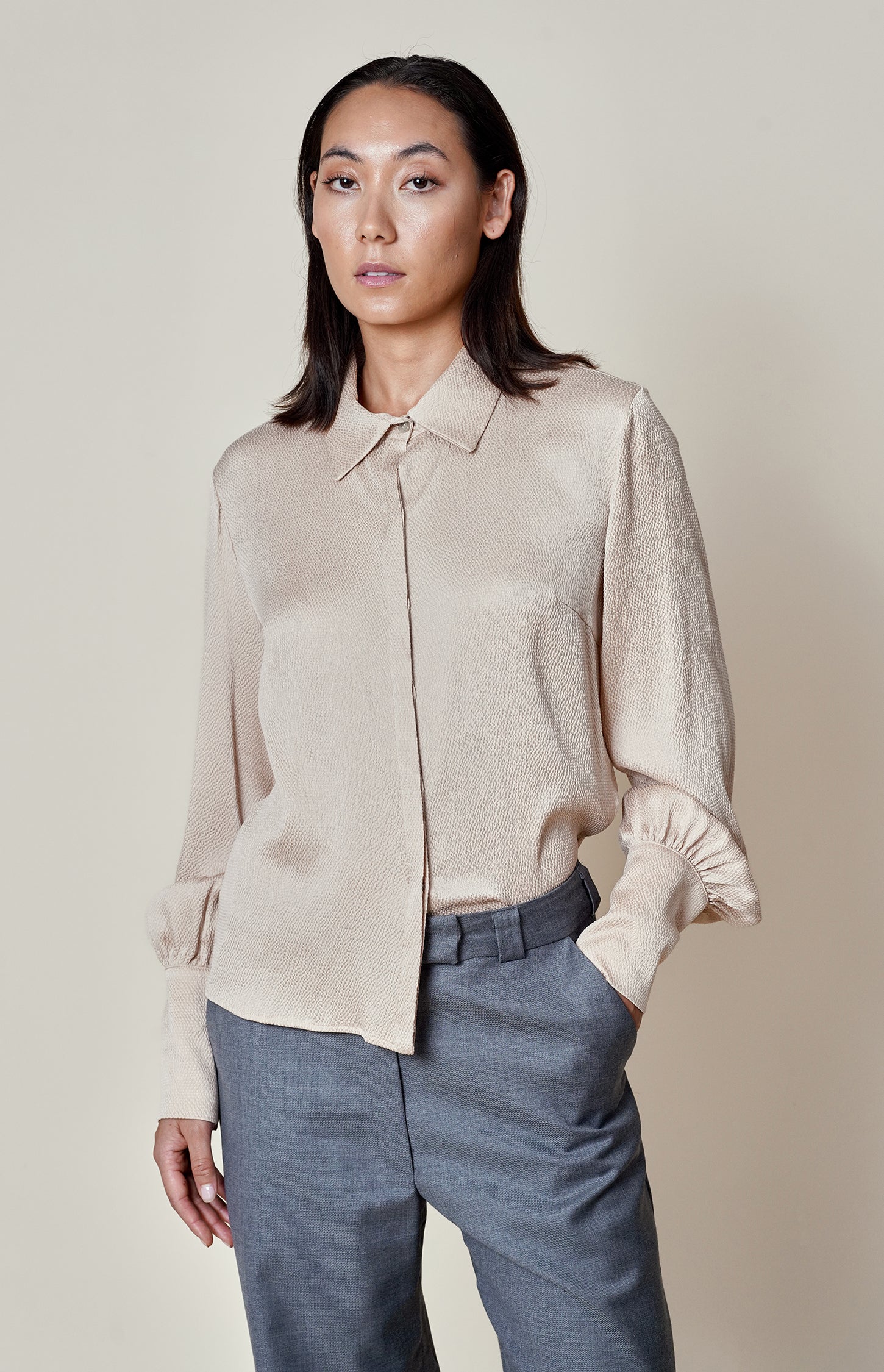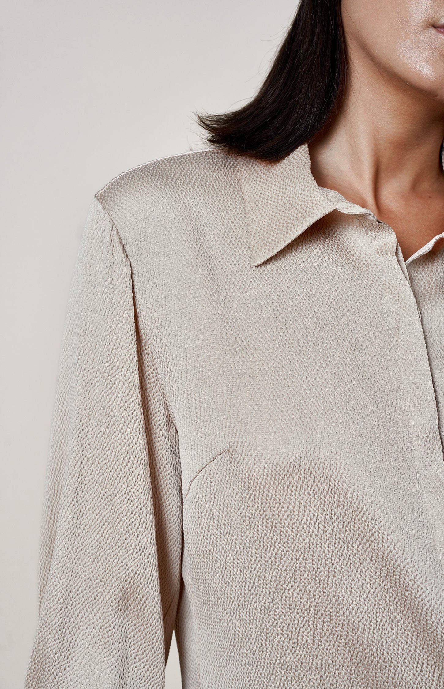 Introducing our soft beige Hammered Silk Shirt, a luxurious and versatile addition to your wardrobe. Crafted from exquisite slightly stretchy material, this shirt features long cuffs, a soft collar, and a figure-complimenting silhouette.