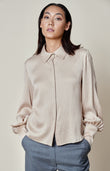 The soft hue and wide collar add an elegant touch, while the concealed buttons to the front provide a subtle yet stylish detail. Wide cuffs create a unique twist on the classic everyday shirt, adding a touch of sophistication to any outfit.