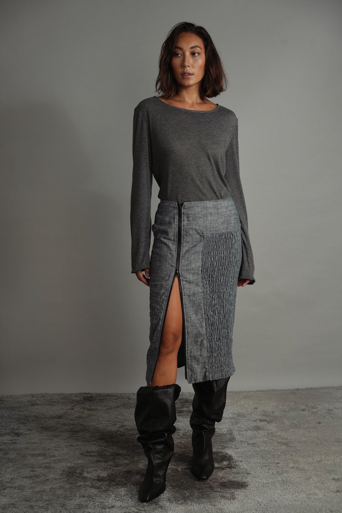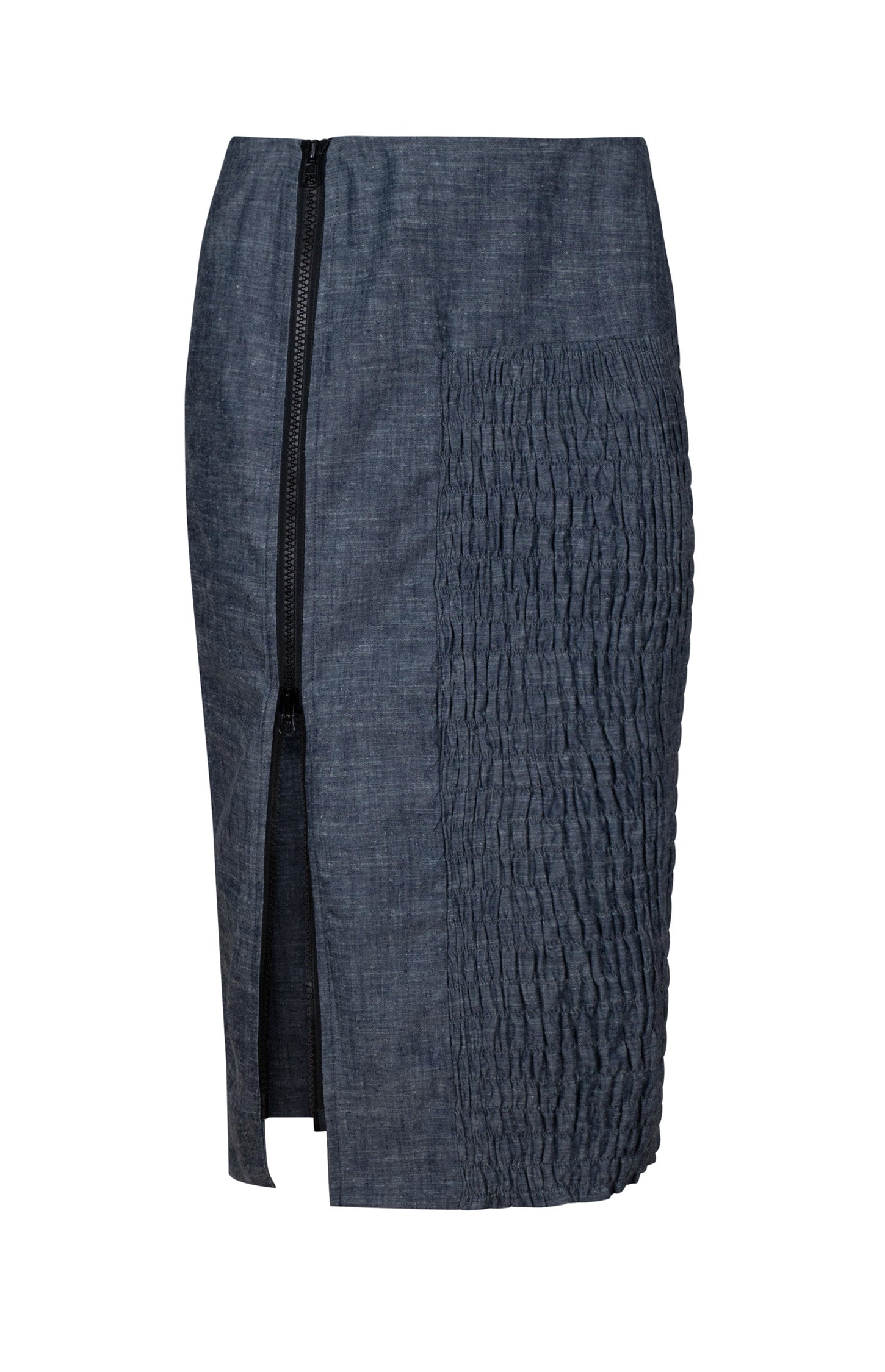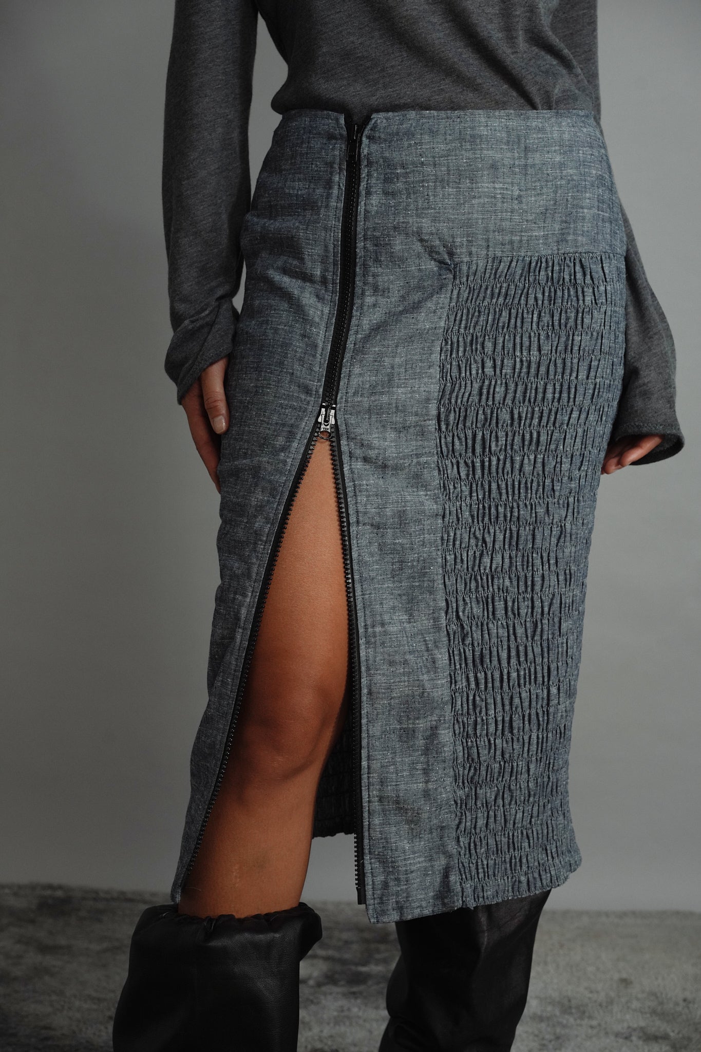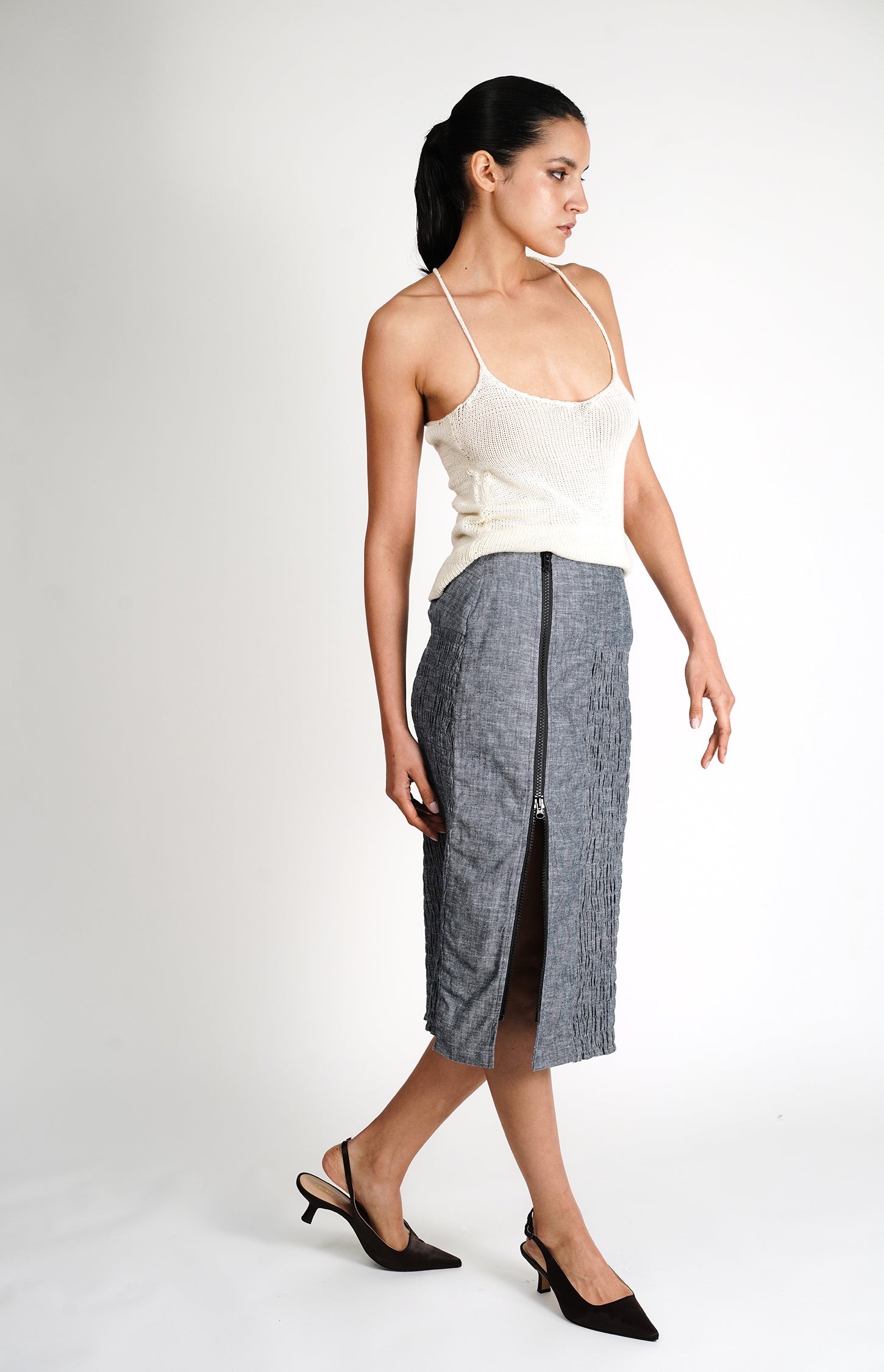 Introducing our cotton crushed mid-length skirt, meticulously designed with technical precision to ensure the perfect fit for every body shape. Featuring an open-end two-way zipper available in various lengths: