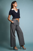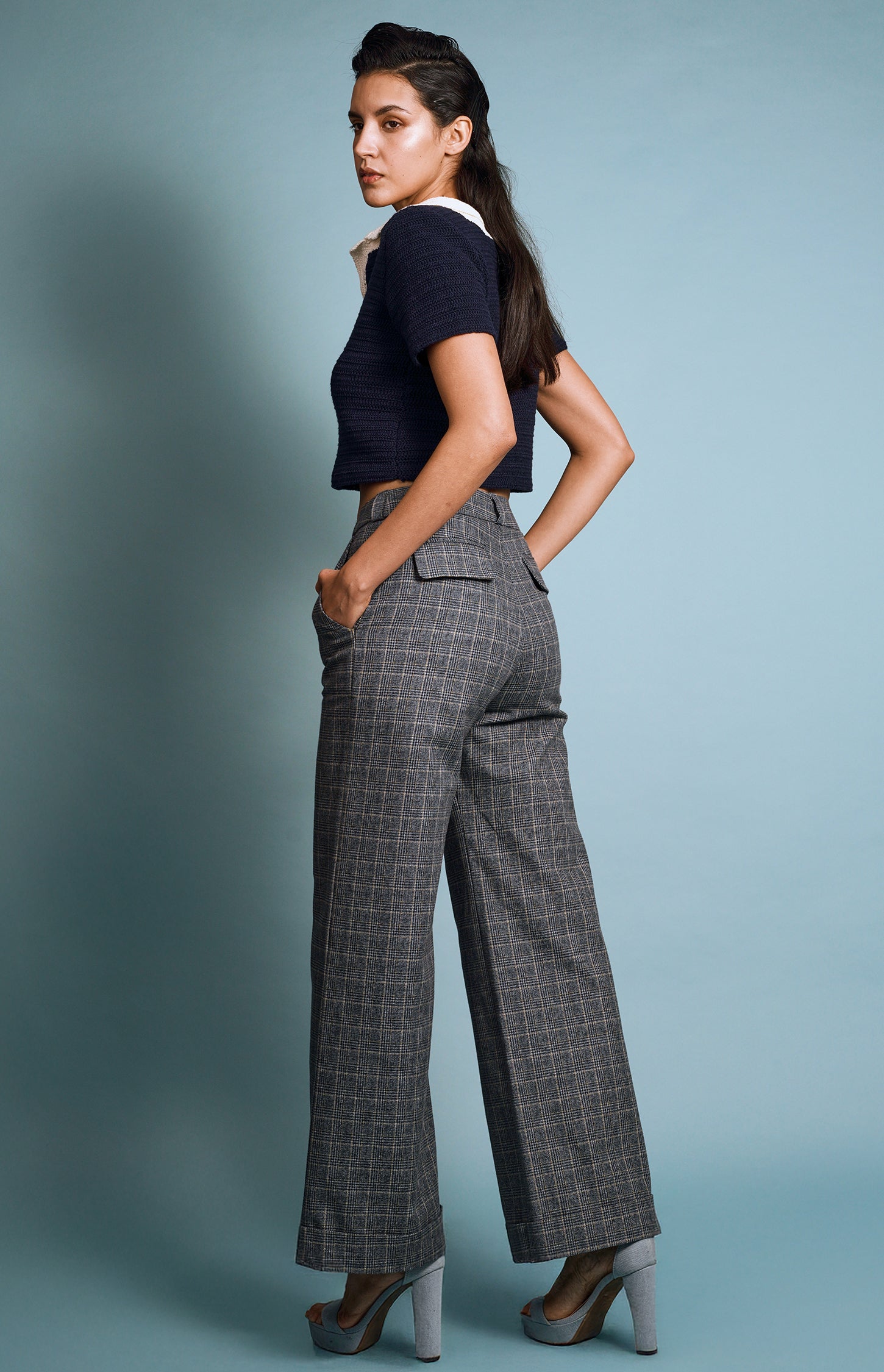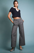 Features: mid-rise waist, side hook fastening, four generously sized pockets, wide-leg, tailored fit