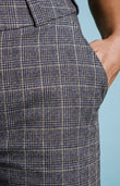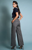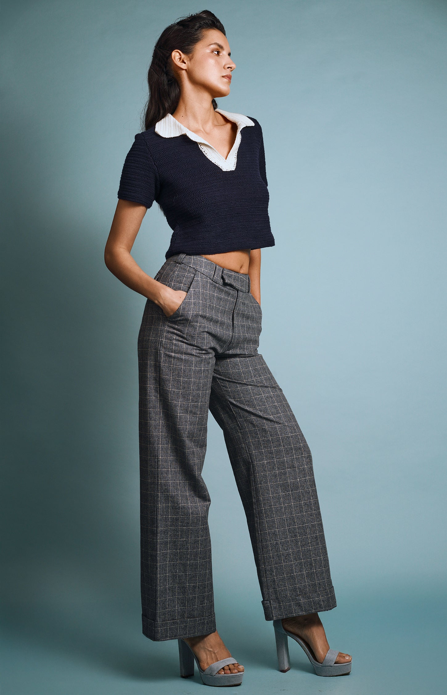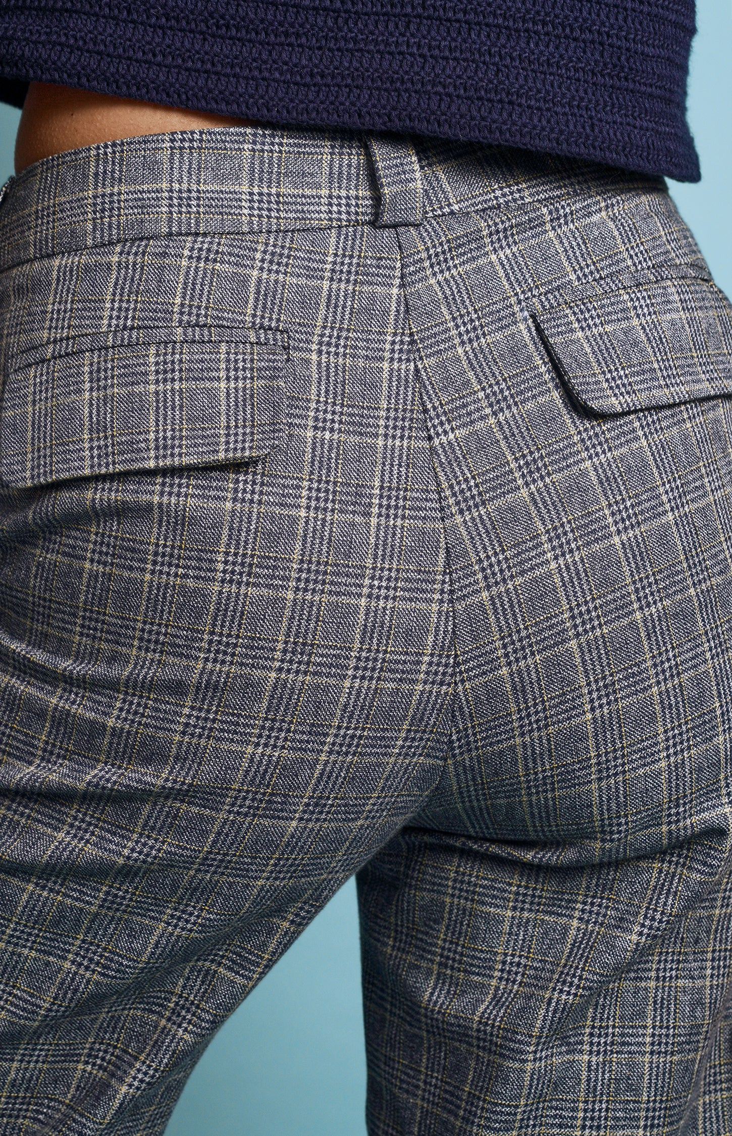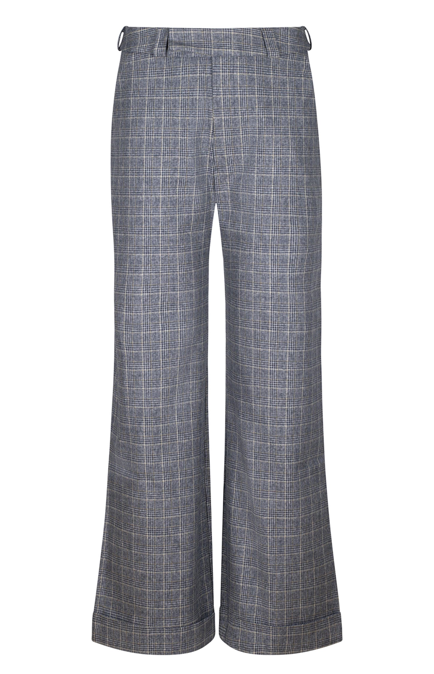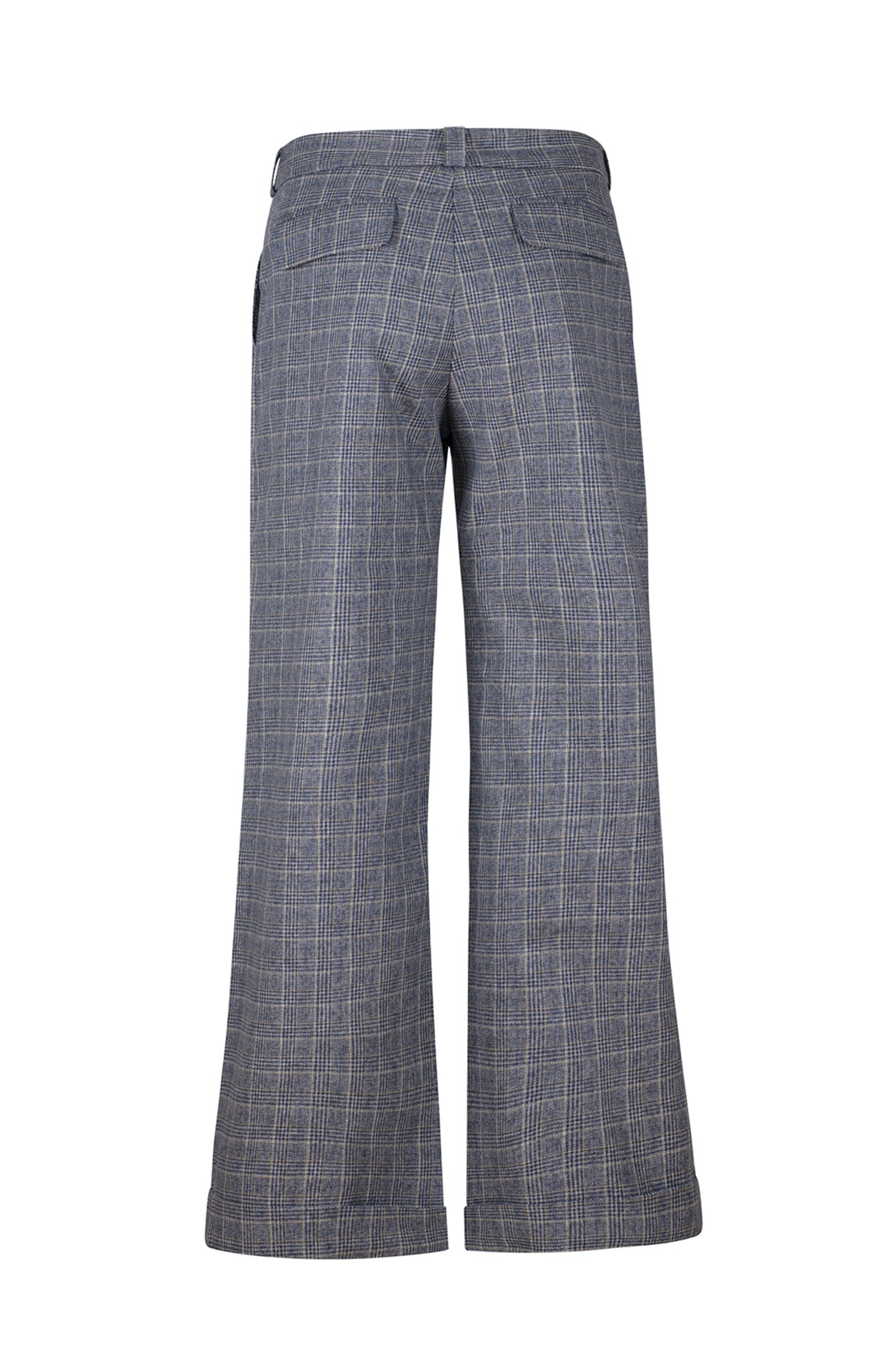 These timeless wide-leg trousers, crafted from blue checked cotton with hints of grey, white, and yellow, are meticulously designed for a perfect fit. Featuring a mid-rise waist with a sleek side hook fastening, they merge fashion with functionality through four generously sized pockets. With technical precision and attention to detail, these trousers provide both coziness and durability, offering a refined and sophisticated look suitable for any occasion.