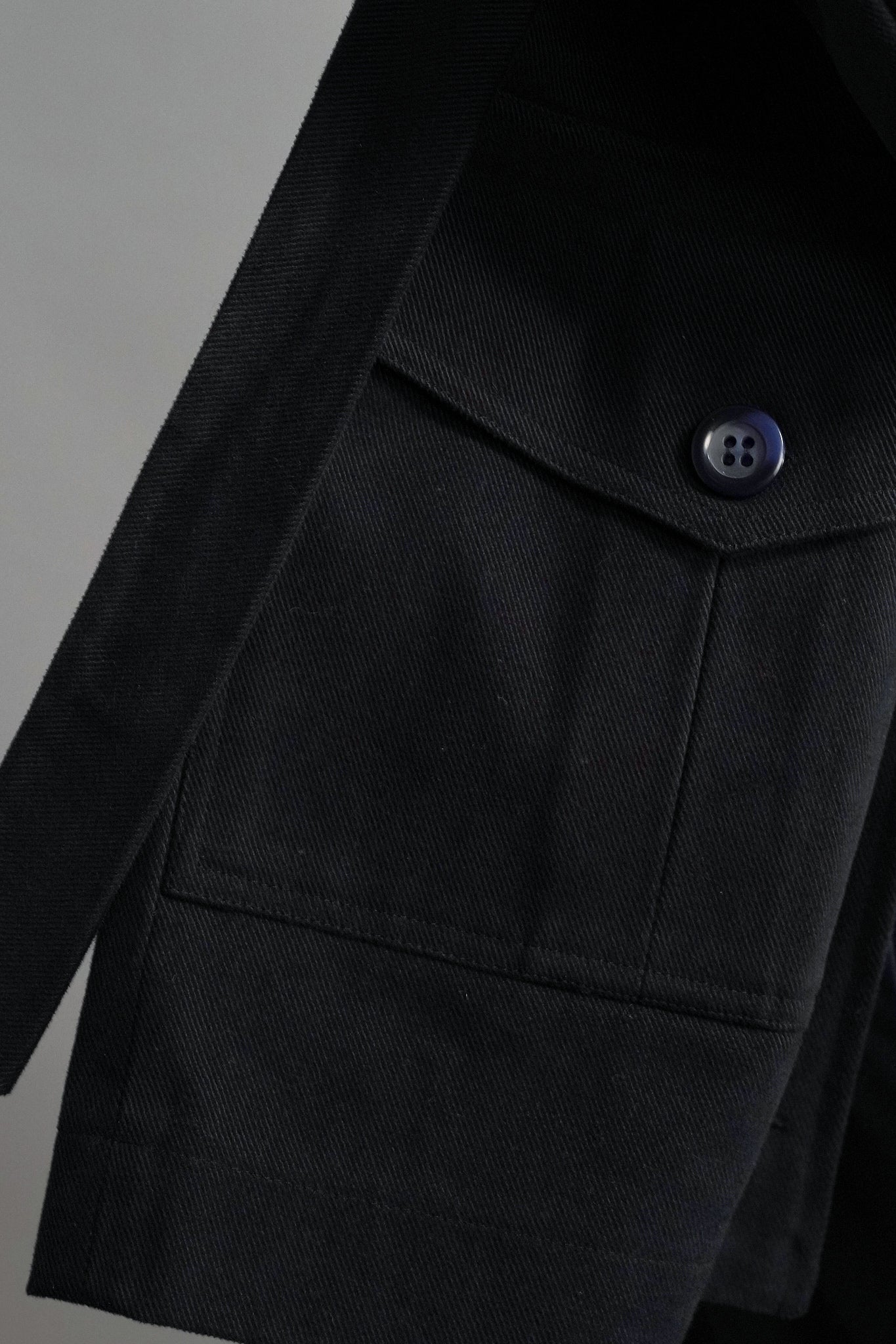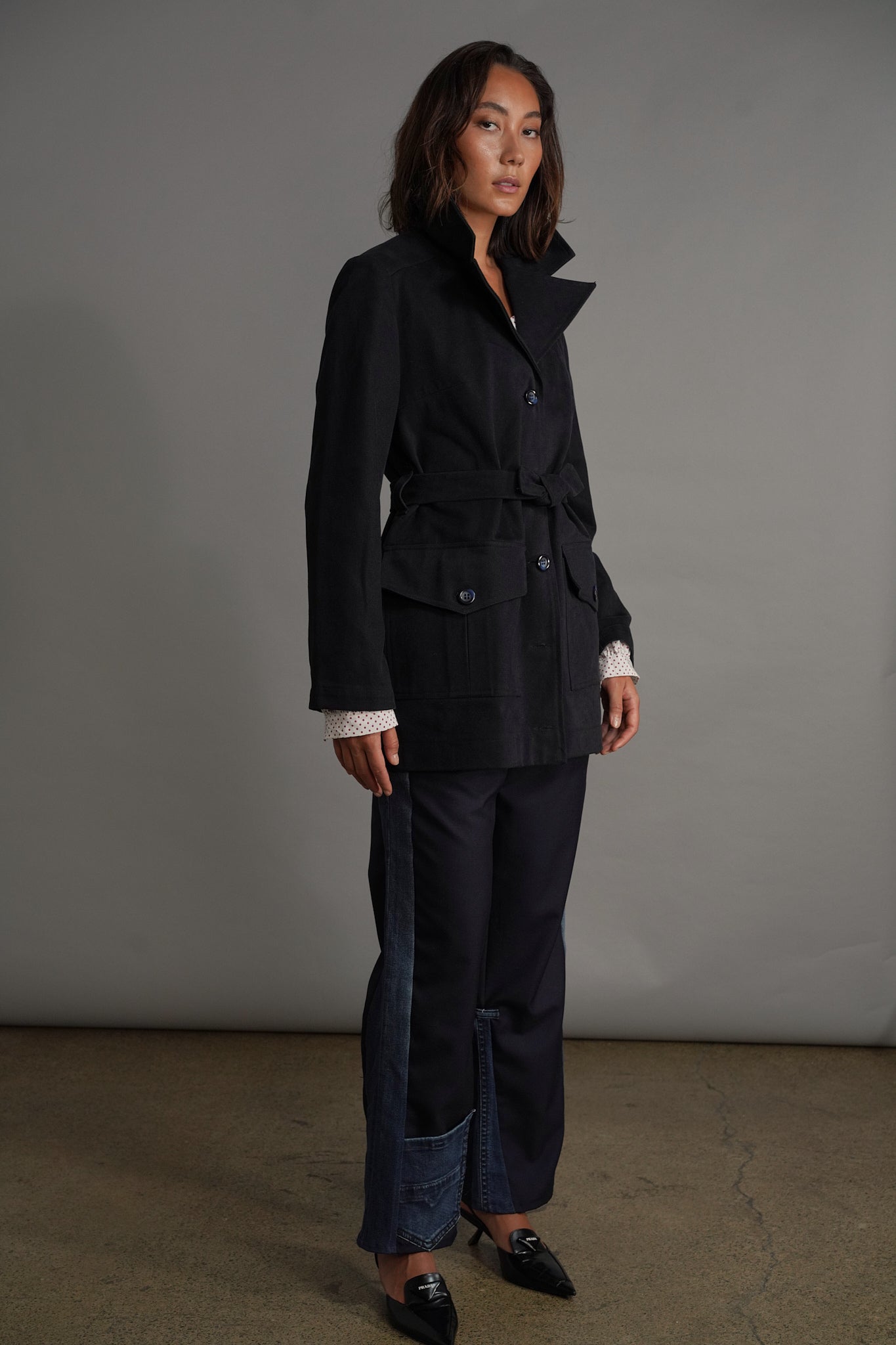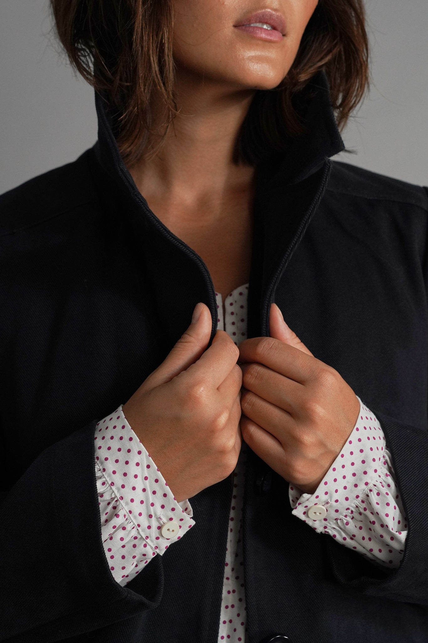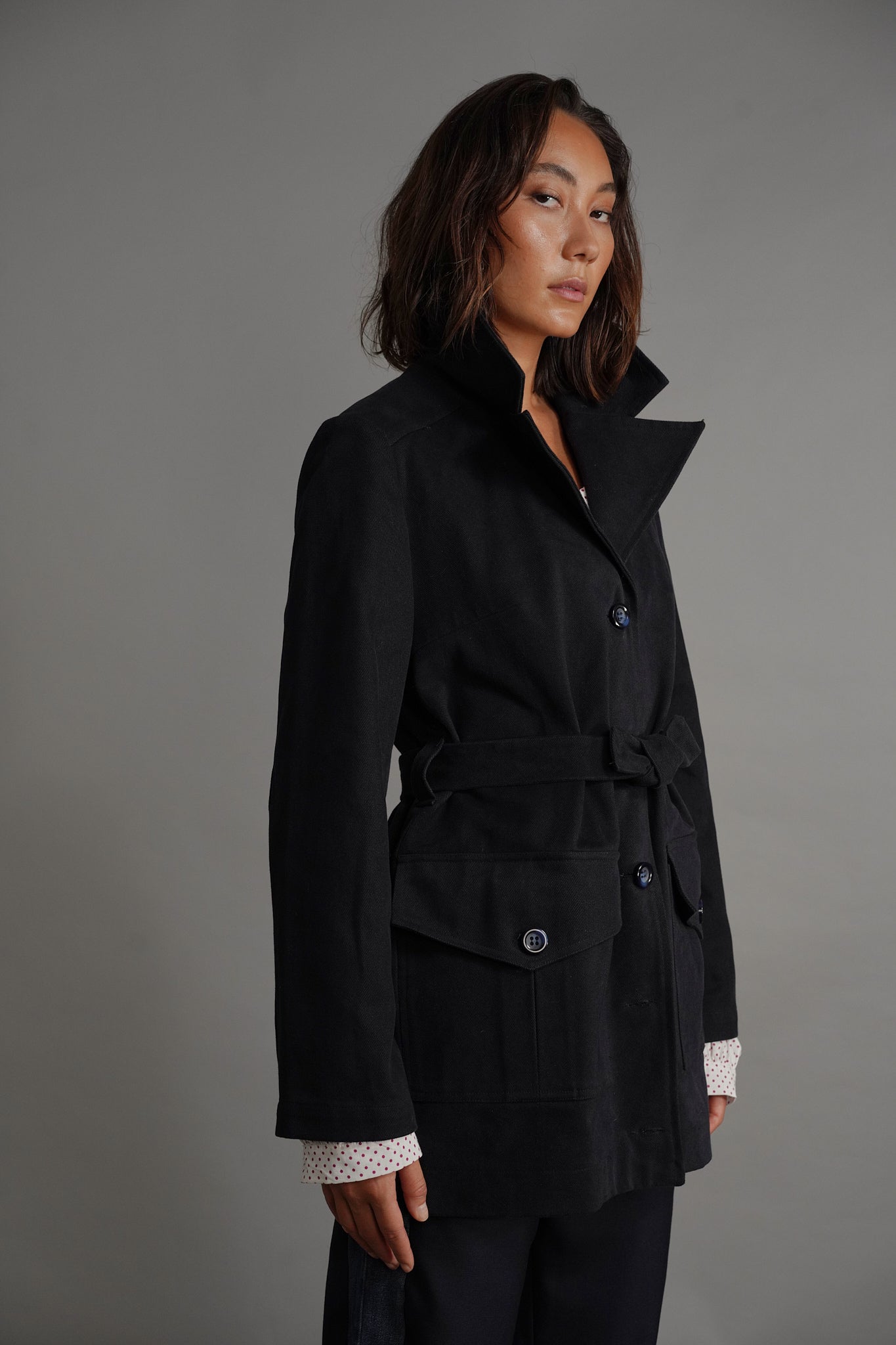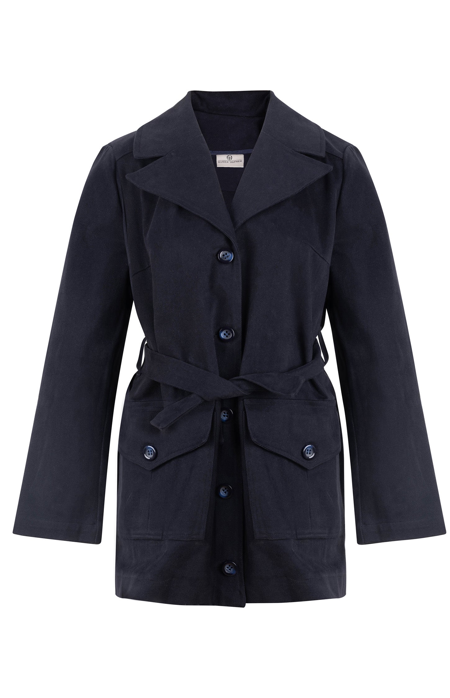 This winter short coat features wide lapels, eco-friendly buttons, and a detachable belt. Two roomy pockets to the front are practical, yet stylish. A luxurious lining is sure to keep you warm this winter. Designed using cotton from a small, UK-based factory that is rich in history, this piece is naturally sustainable and hypoallergenic.