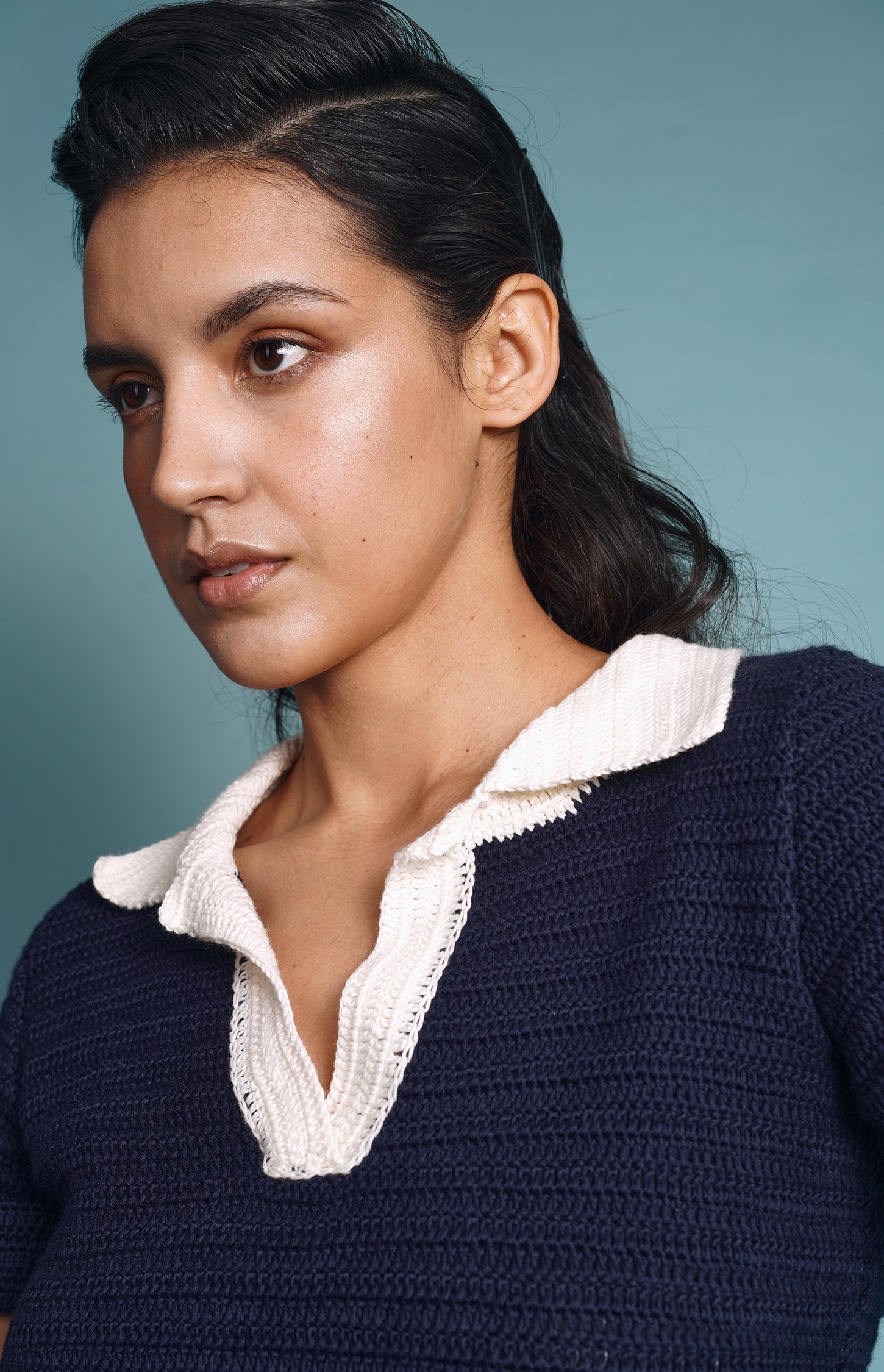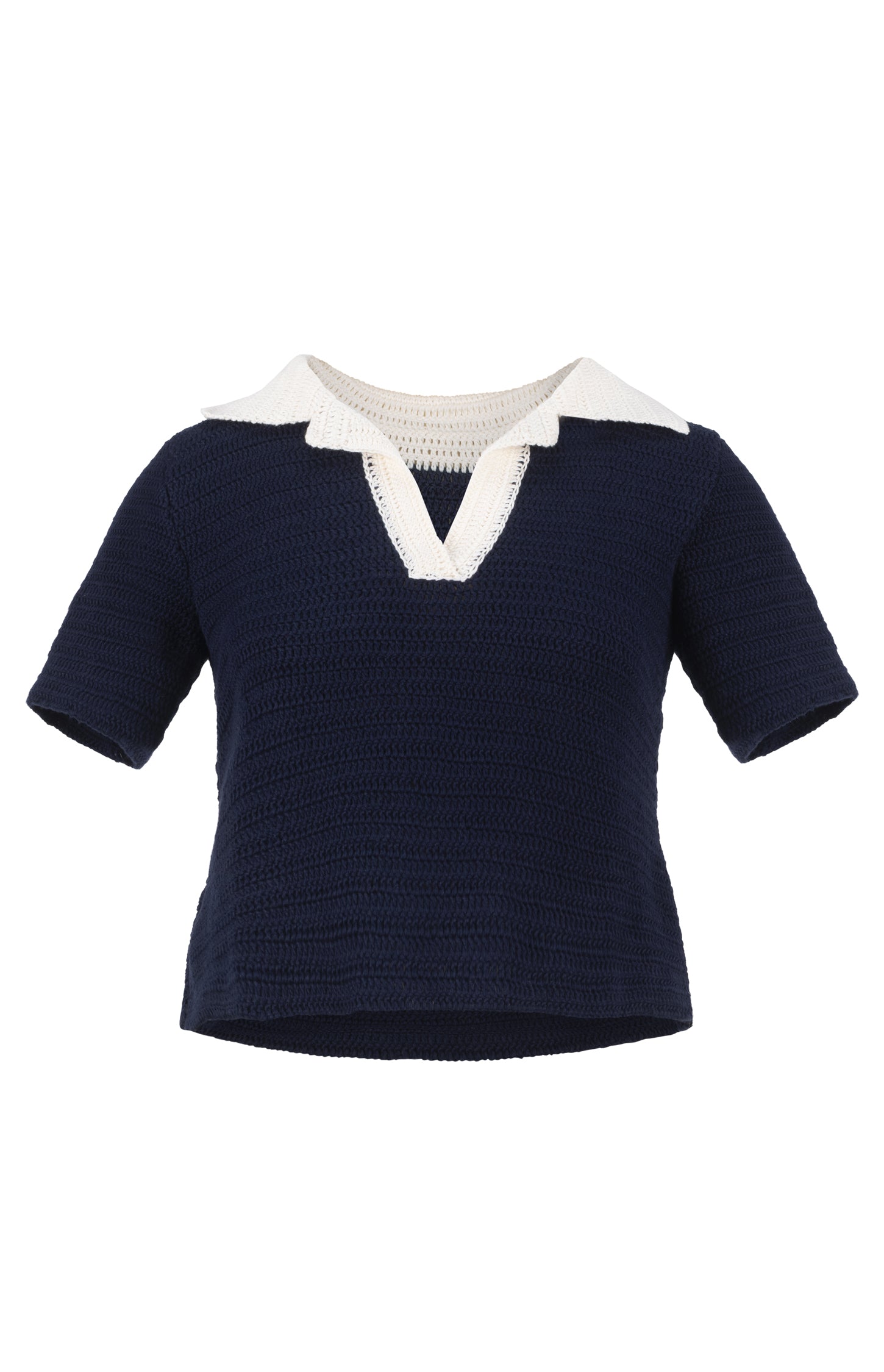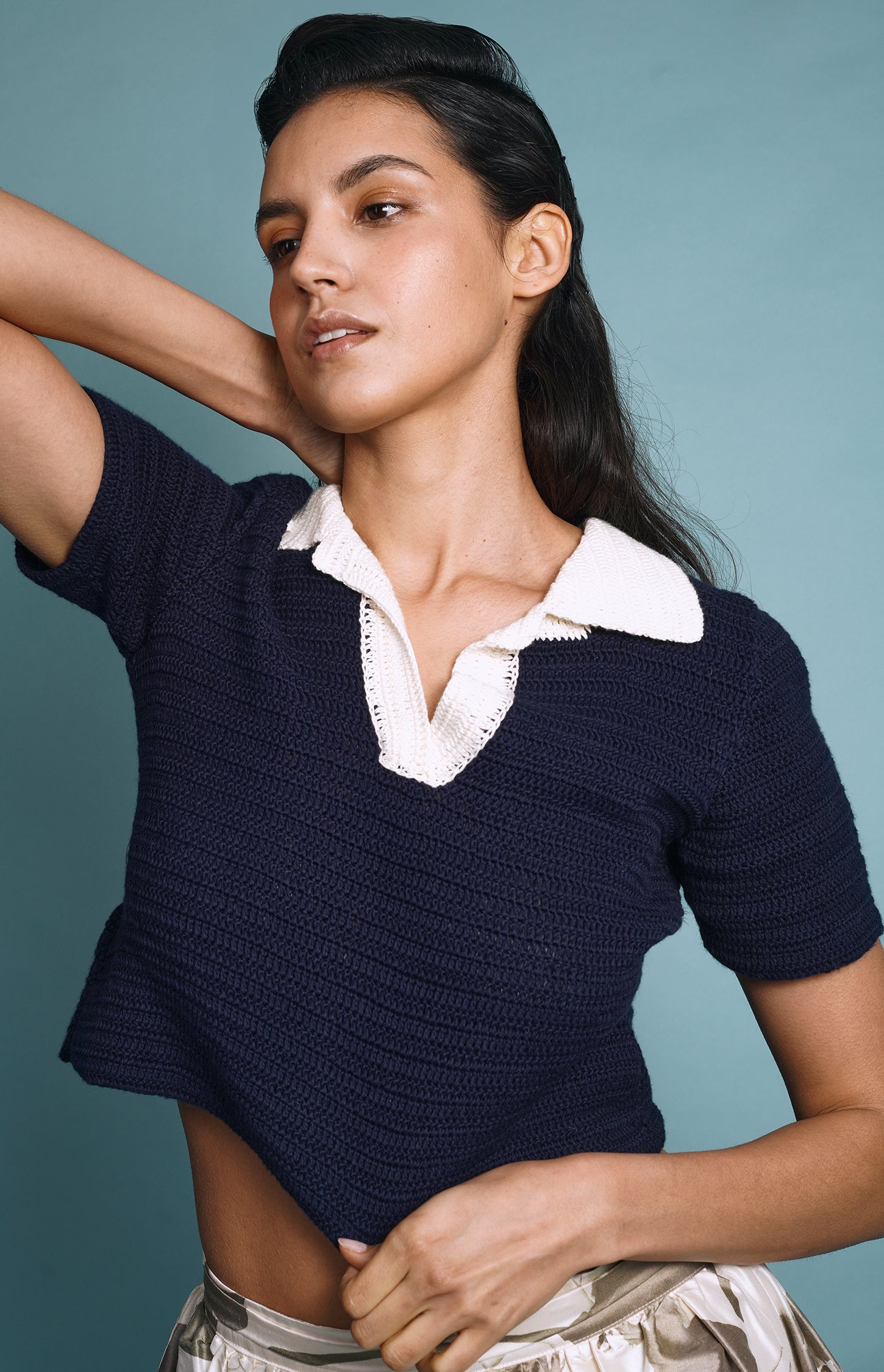 Introducing our handcrafted blue crochet polo shirt, a unique blend of artisanal craftsmanship and effortless style. Made in the UK, this piece showcases intricate crochet detailing, offering a breathable and lightweight feel. The crisp white collar adds a polished contrast, elevating its classic silhouette with a touch of preppy charm.