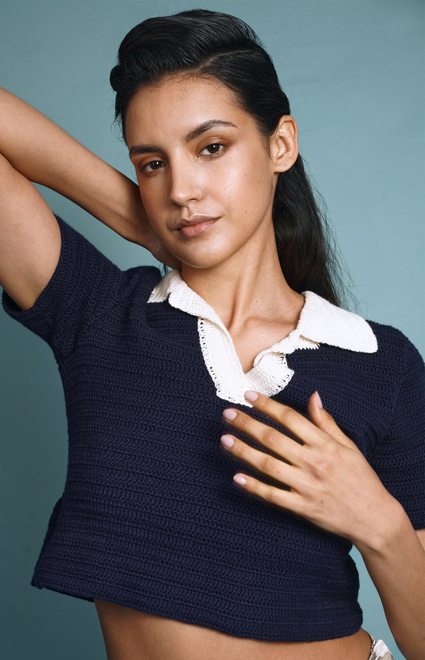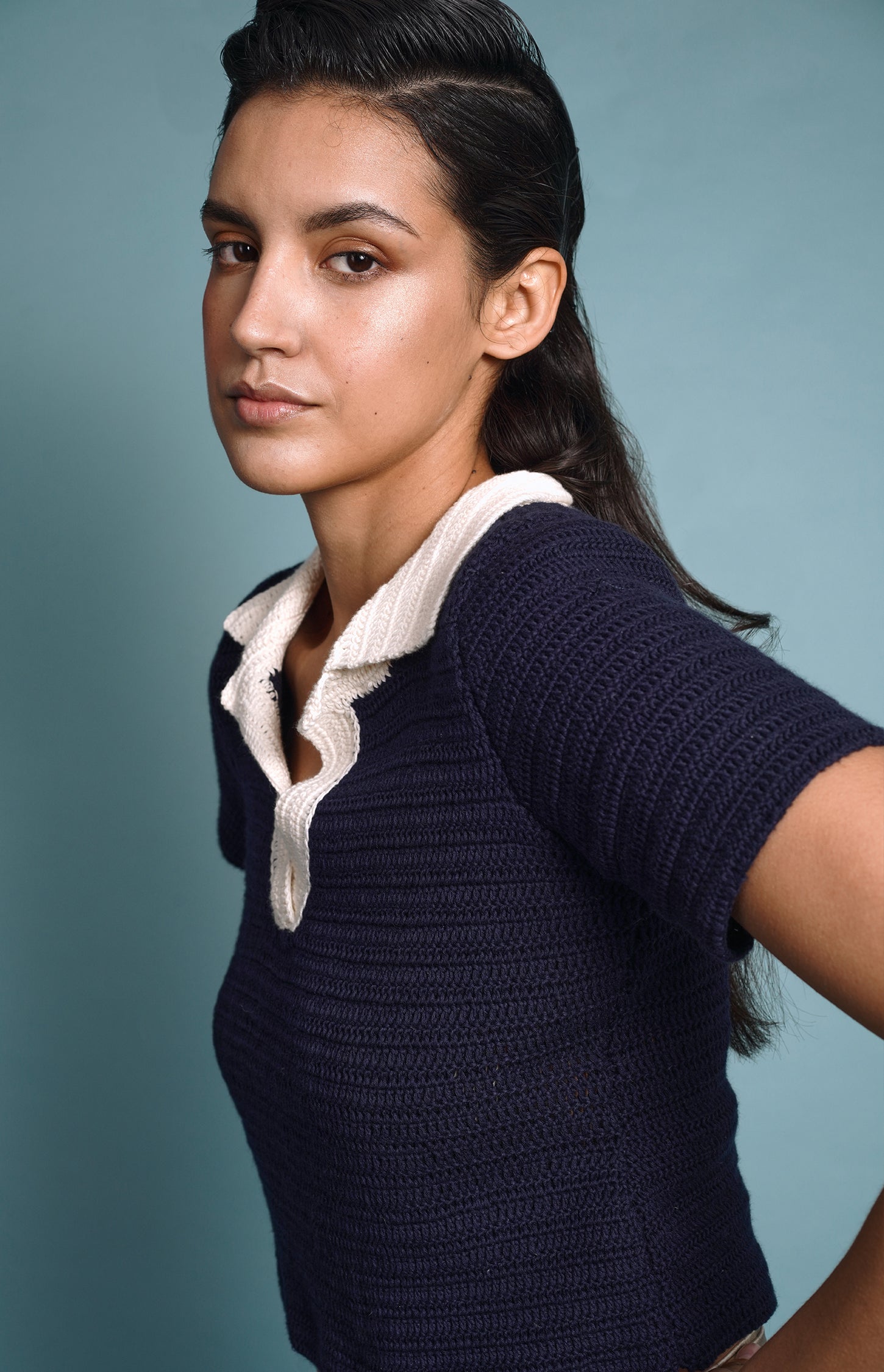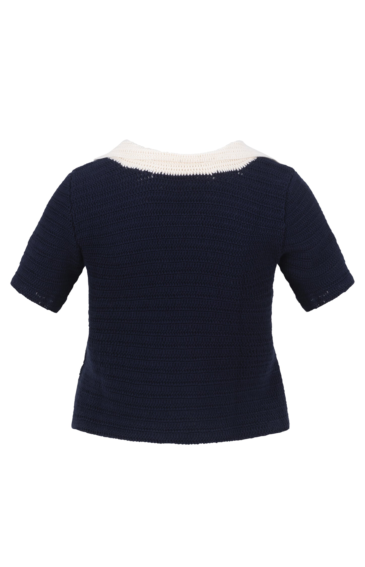 Introducing our handcrafted blue crochet polo shirt, a unique blend of artisanal craftsmanship and effortless style. Made in the UK, this piece showcases intricate crochet detailing, offering a breathable and lightweight feel. The crisp white collar adds a polished contrast, elevating its classic silhouette with a touch of preppy charm.
