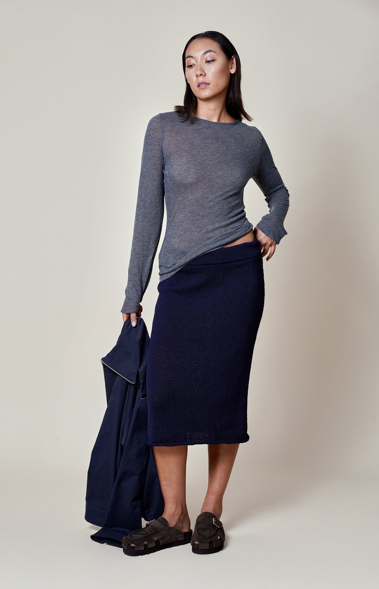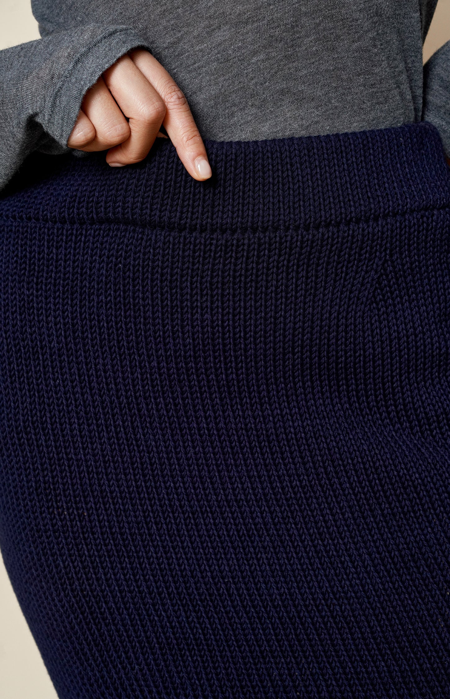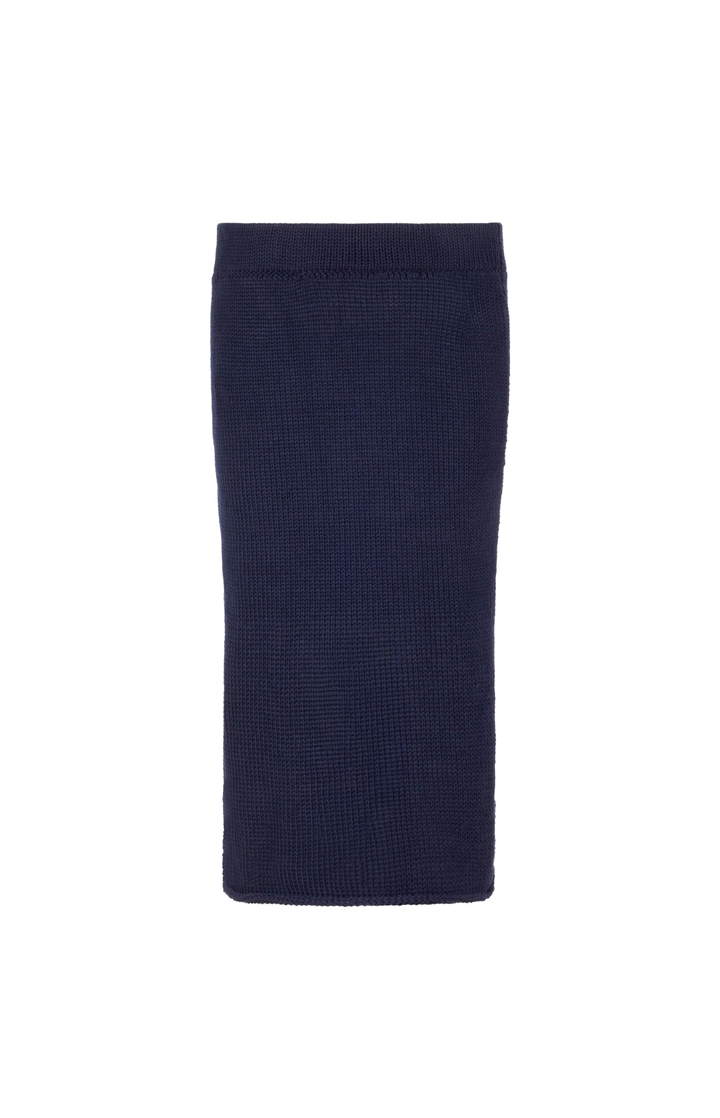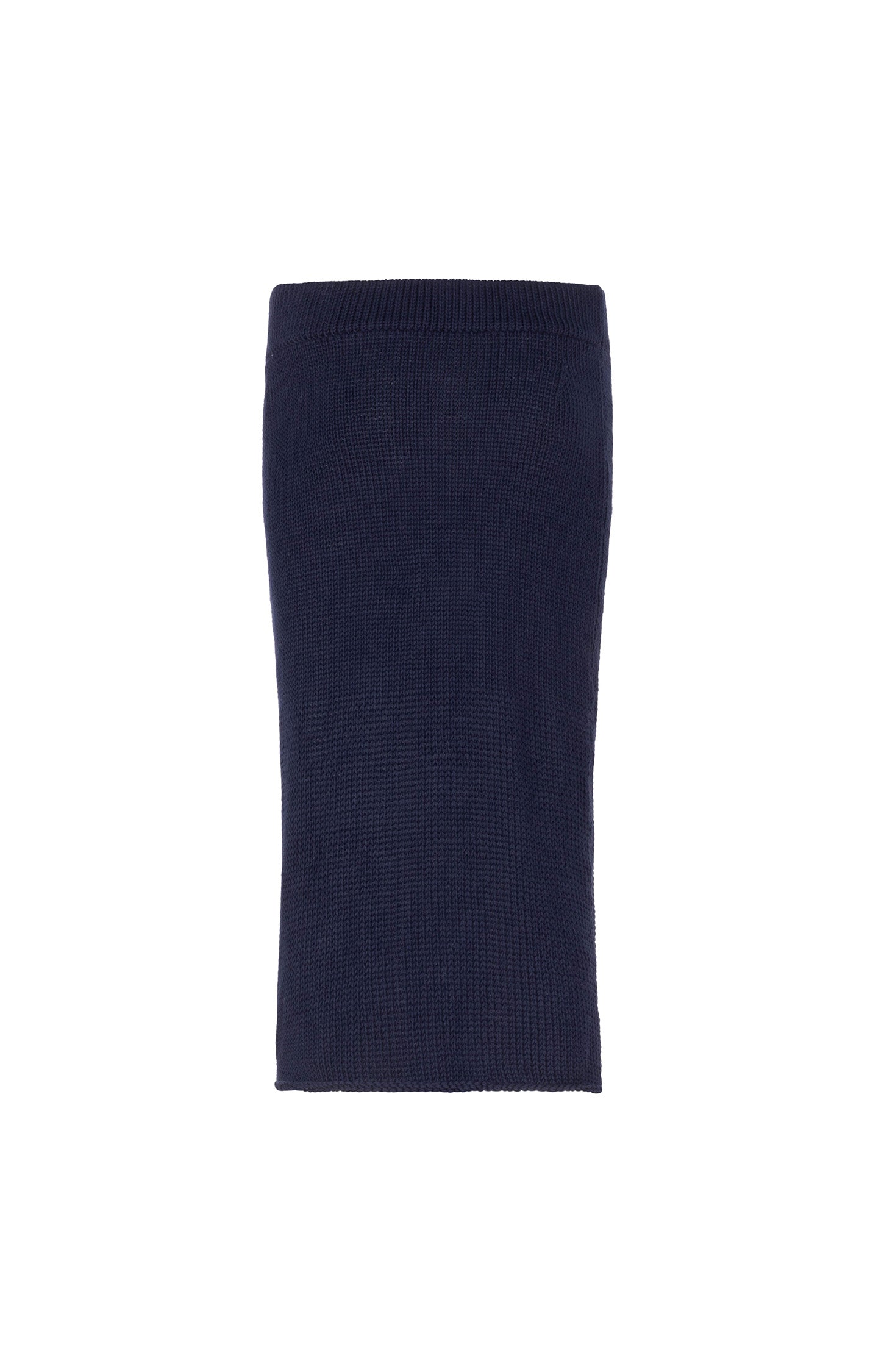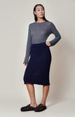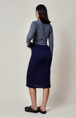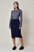 This fitted navy knit skirt is a modern play on texture and transparency. Crafted from a refined blend of 85% cotton and 15% the softest merino wool, this mid-calf design features a sheer knit at the hem that contrasts with the denser, non-sheer structure of the upper part. The result is a silhouette that is both sophisticated and subtly daring.