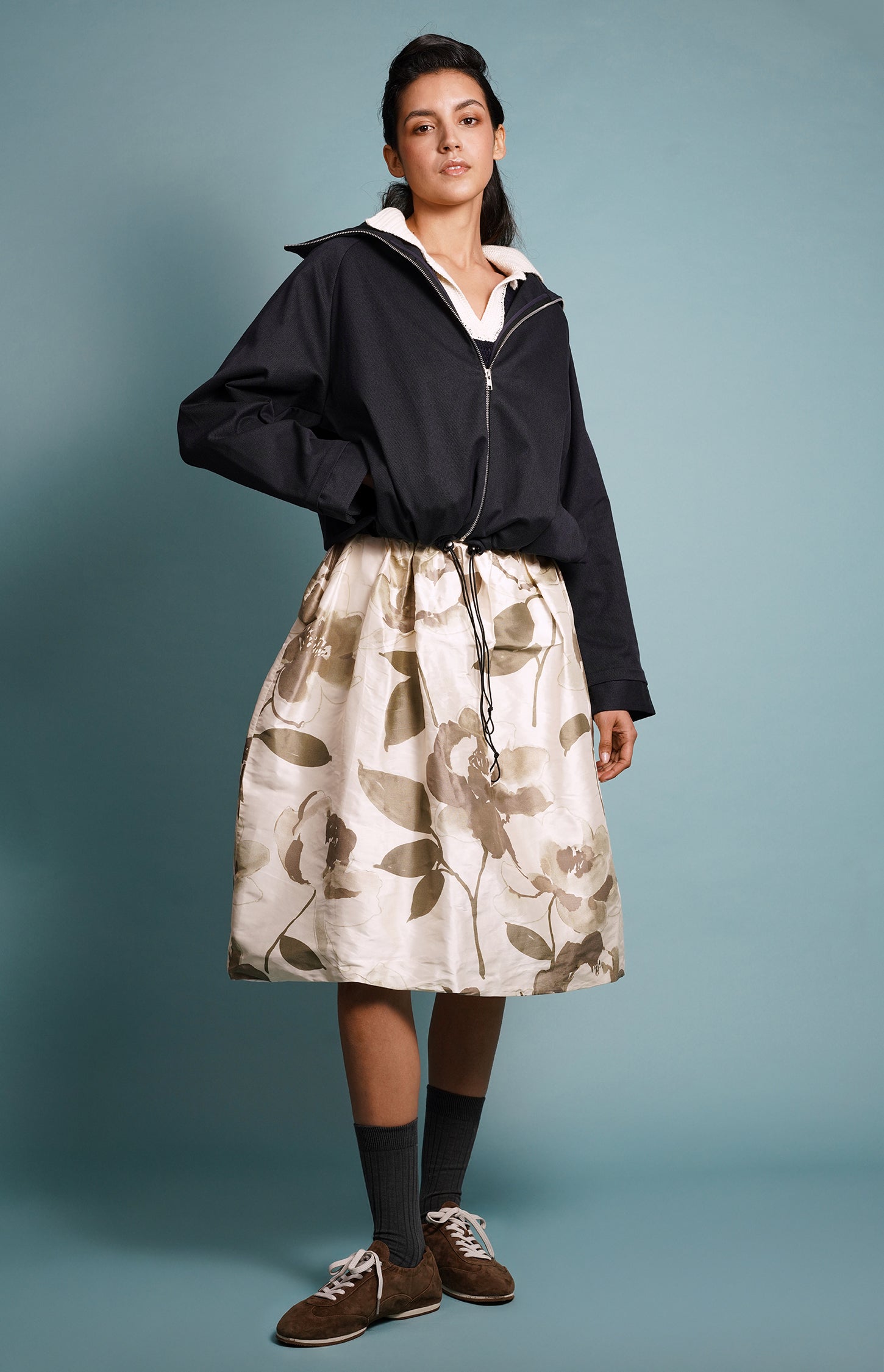 Features: Side seam pockets, adjustable elastic hem, statement collar and cuffs