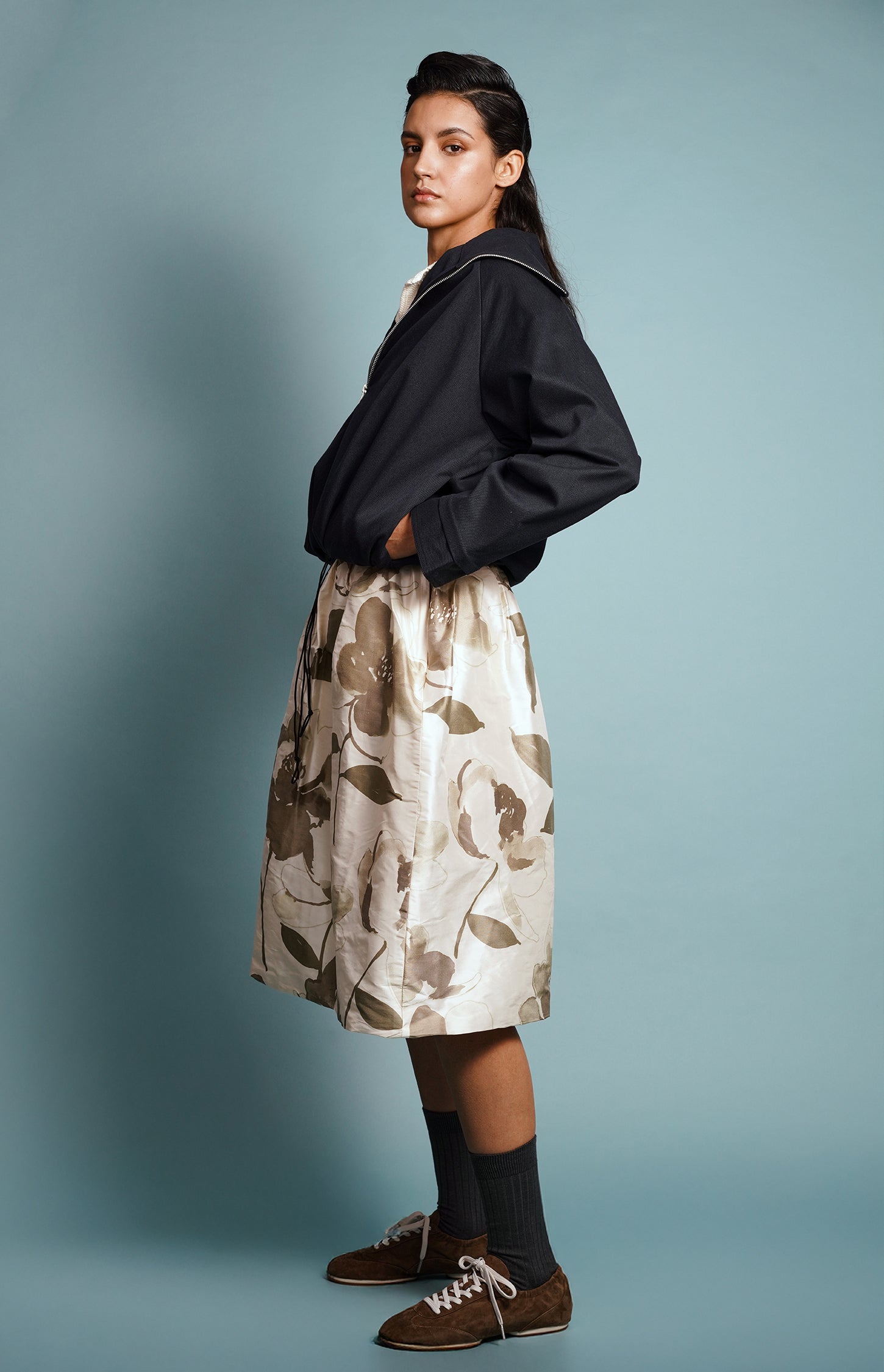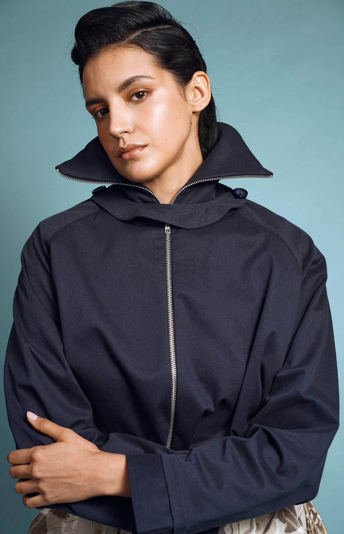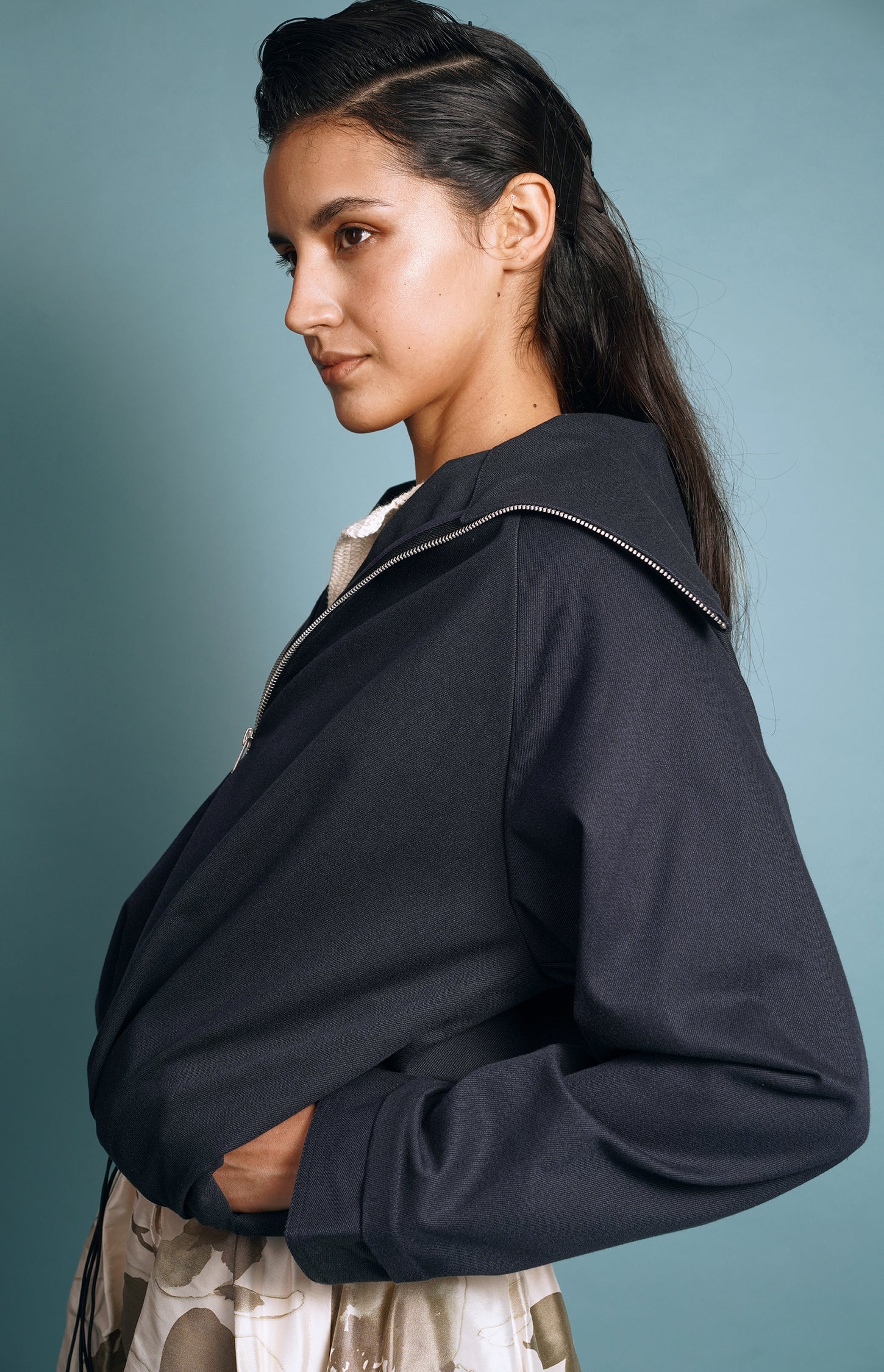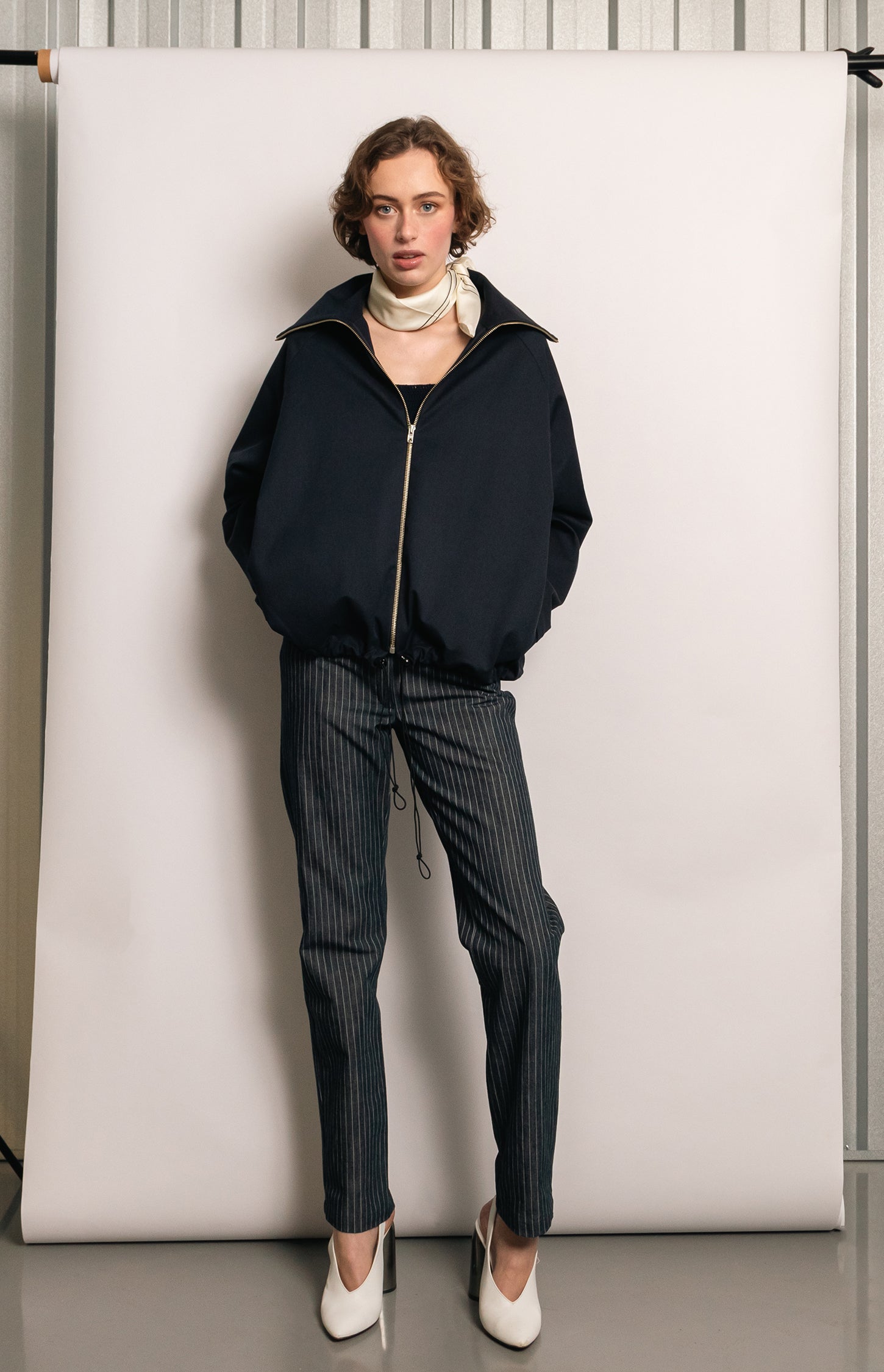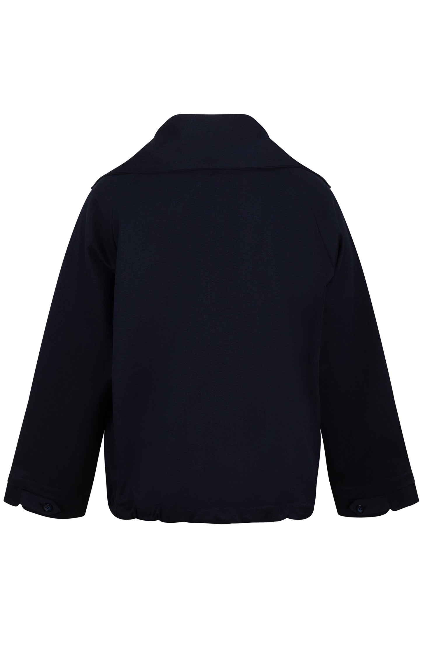 Introducing our Navy Cotton Twill Jacket, designed for both style and durability. Featuring side seam pockets for added practicality, this jacket also boasts an adjustable elastic hem to ensure a comfortable, customizable fit. The statement collar and cuffs add a bold touch, while the high-end finished seams with bias binding elevate the overall design. A sturdy zip ensures a secure and smooth fastening.
