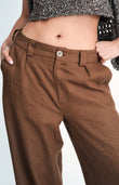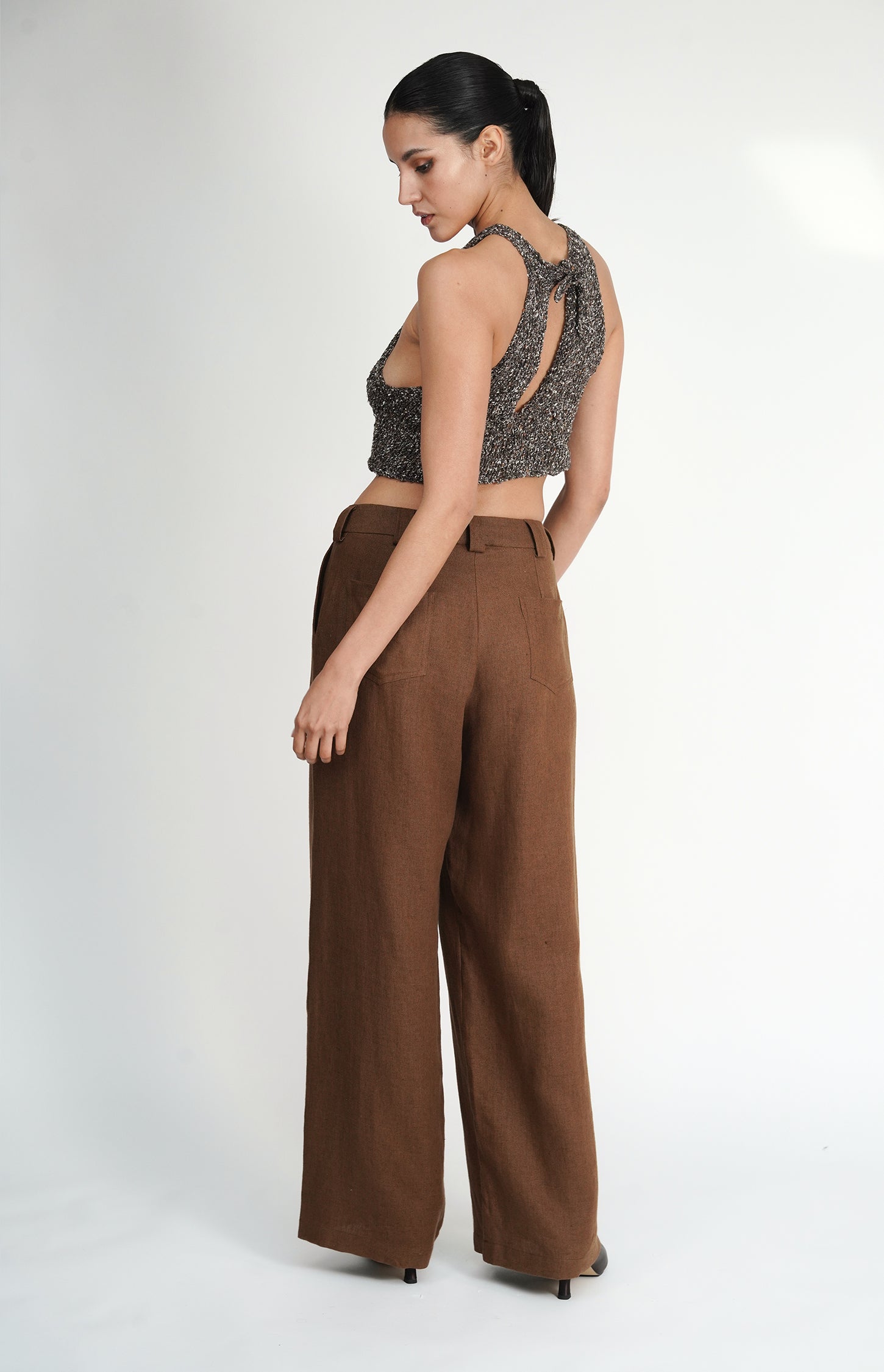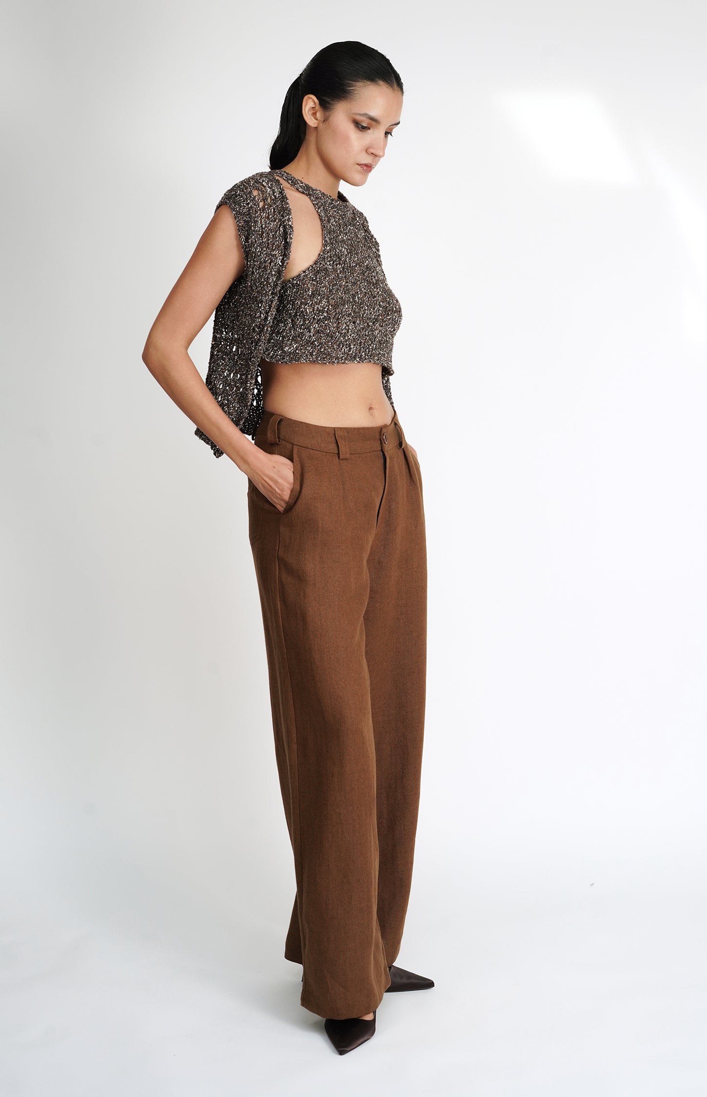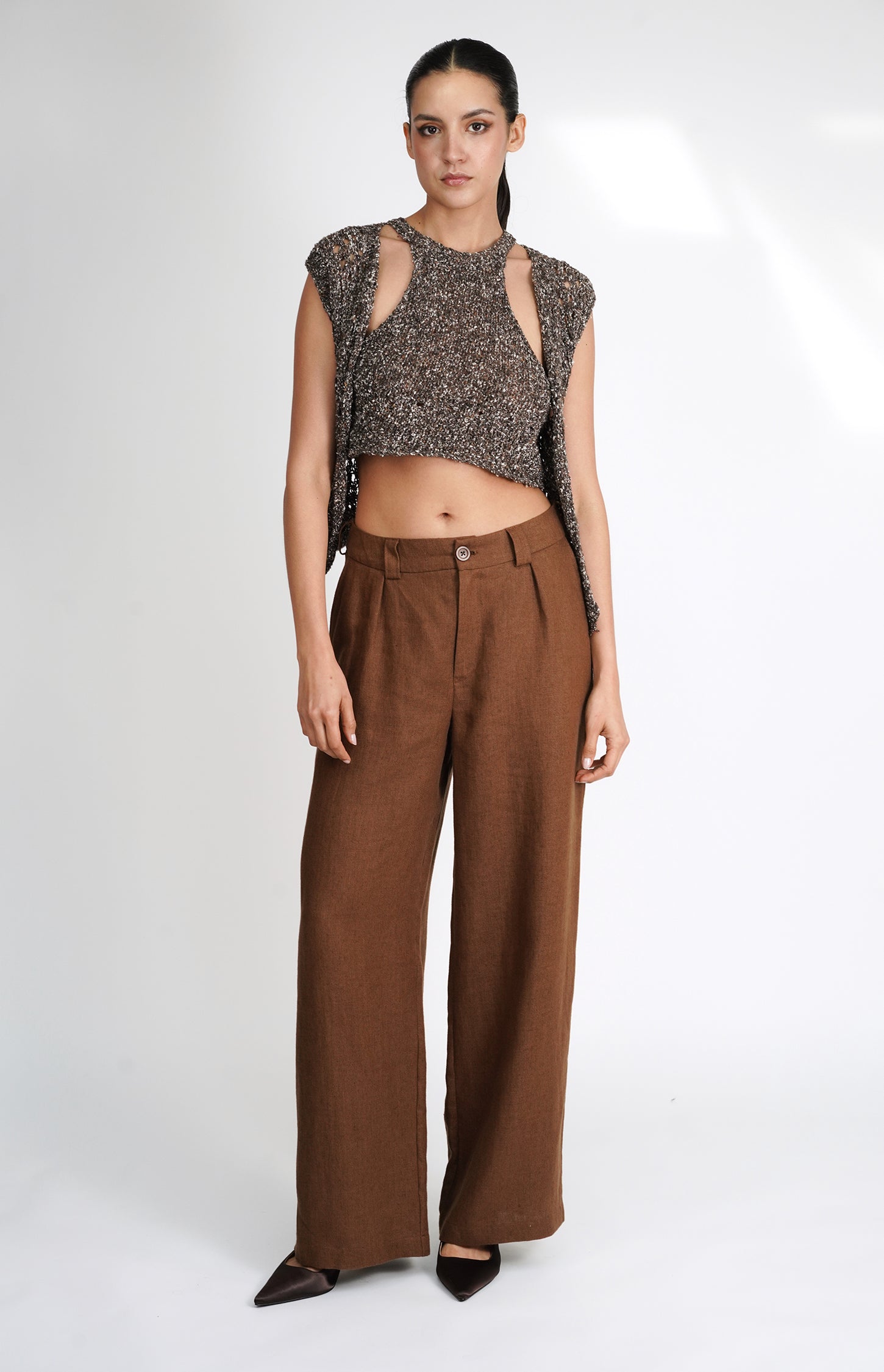 Introducing our Wide Leg Brown Linen Trousers, designed to offer effortless style and comfort. Crafted from lightweight linen, these trousers feature a flattering wide-leg silhouette that moves with ease. The slanted front pockets provide practicality, while the patch back pockets add a casual touch to the design.