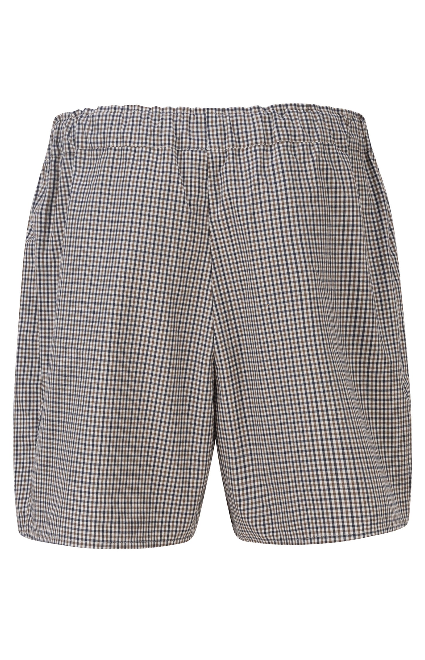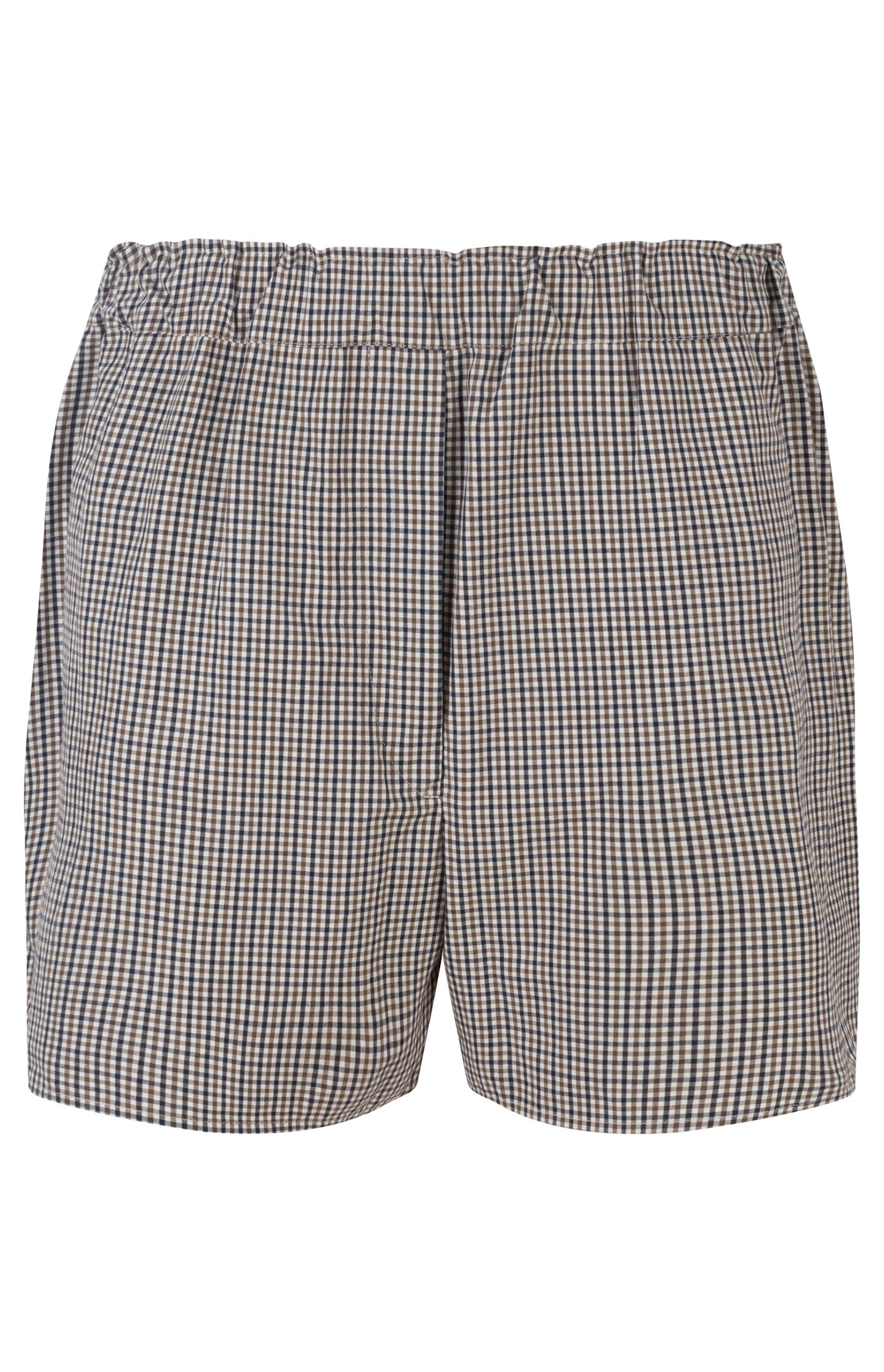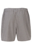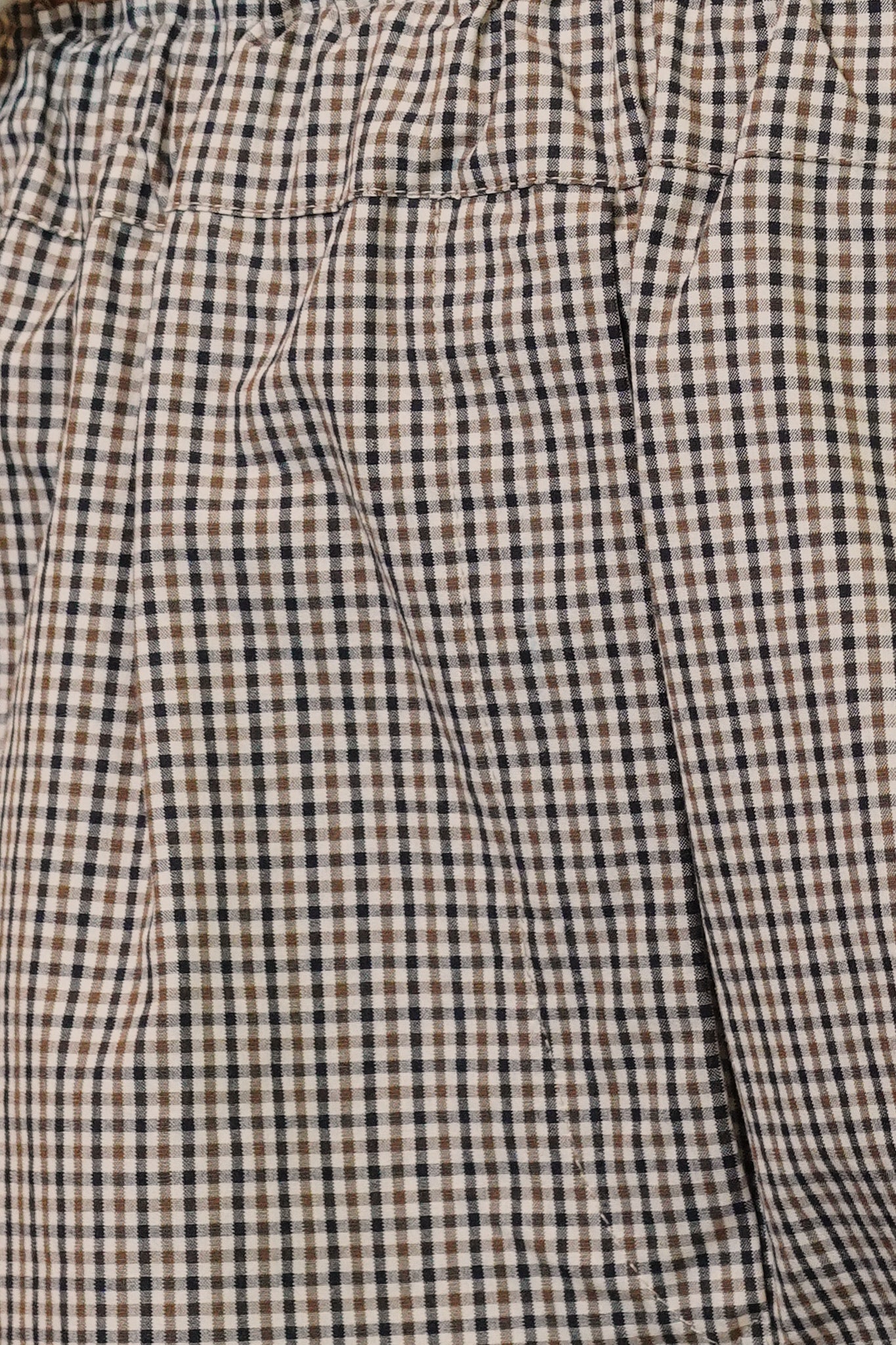 These checked cotton shorts feature a boxer-style design with a wrap skirt overlay and a mock fly for a unique touch. Crafted from tensely woven material, they offer durability and comfort. The elastic waistband ensures a secure and comfortable fit, making these shorts a versatile addition to your wardrobe.