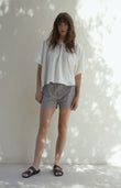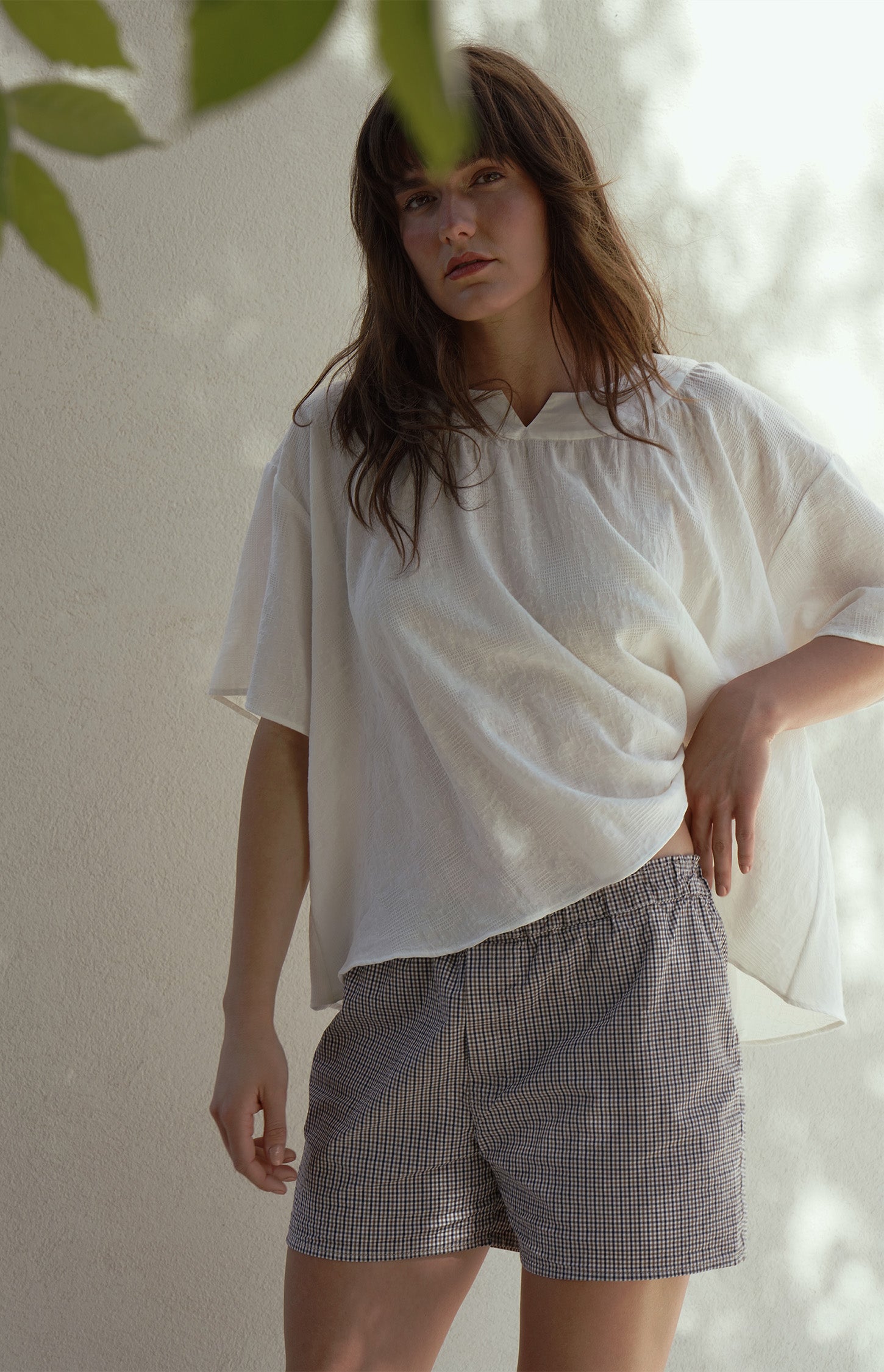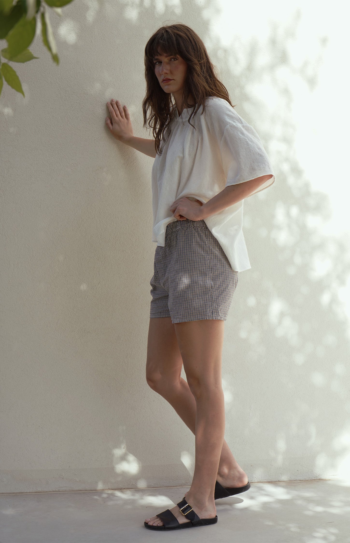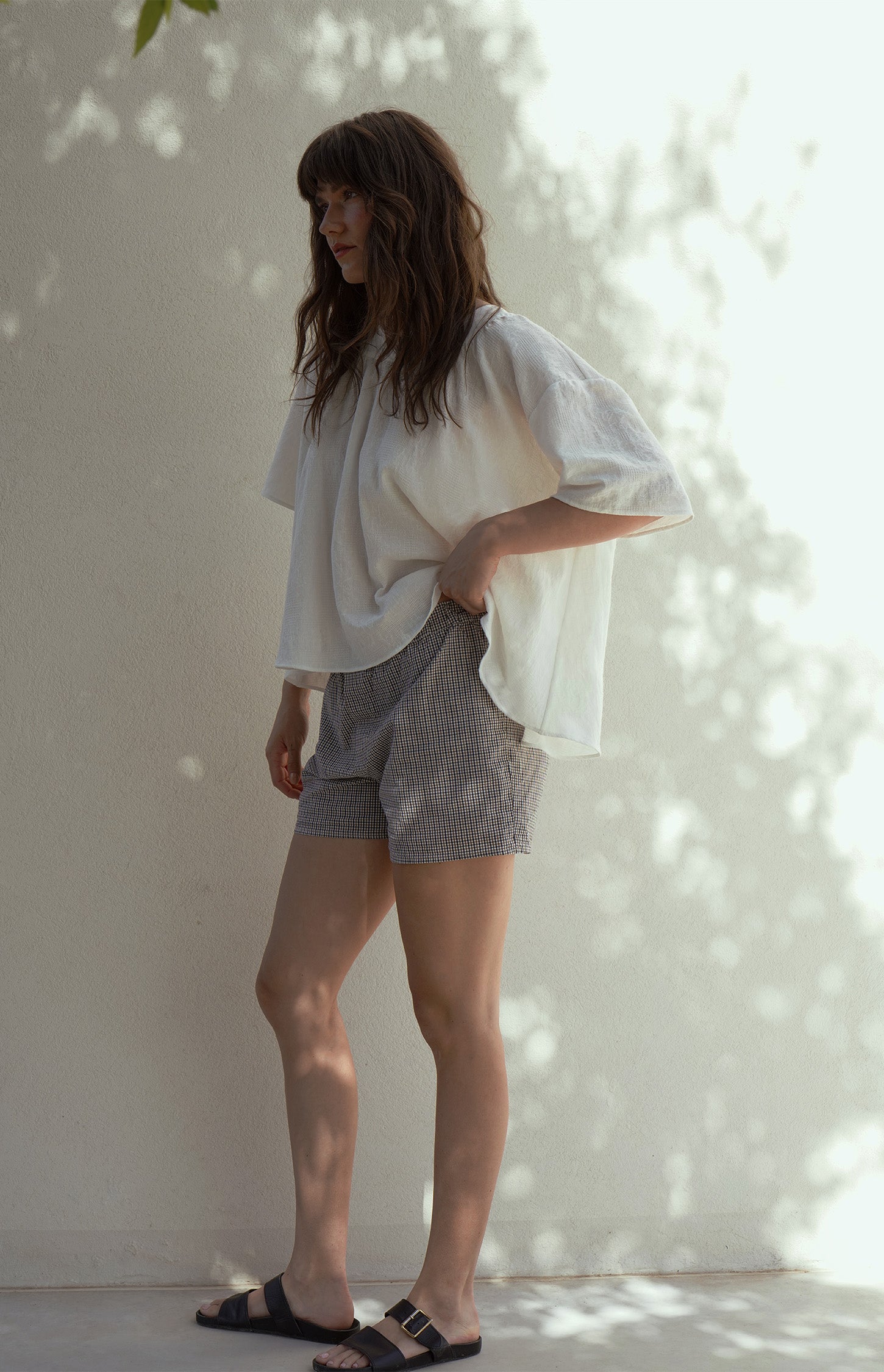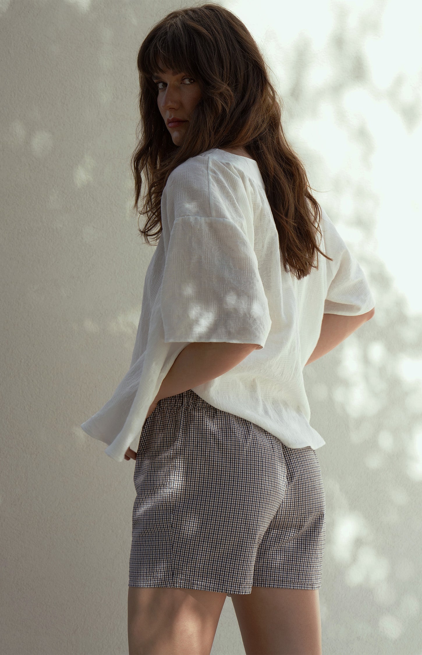 These checked cotton shorts feature a boxer-style design with a wrap skirt overlay and a mock fly for a unique touch. Crafted from tensely woven material, they offer durability and comfort. The elastic waistband ensures a secure and comfortable fit, making these shorts a versatile addition to your wardrobe.