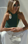Introducing our luxurious green sleeveless turtleneck top, a refined blend of timeless elegance and artistic detail. Crafted from the softest cashmere knit, this piece offers a sumptuously smooth feel with a flattering, form-fitting silhouette. An intricate embroidered flower design blooms from the front, tracing gracefully across the back of the neck and over the left shoulder, adding a touch of delicate craftsmanship.