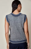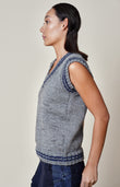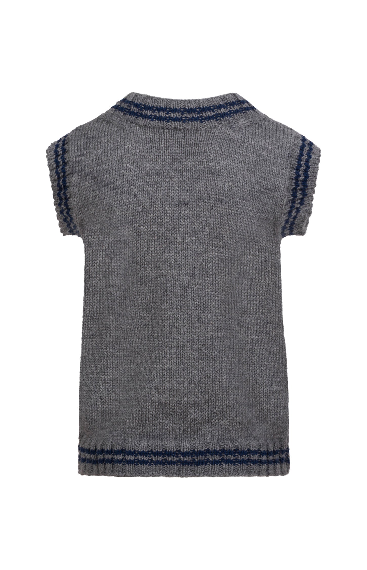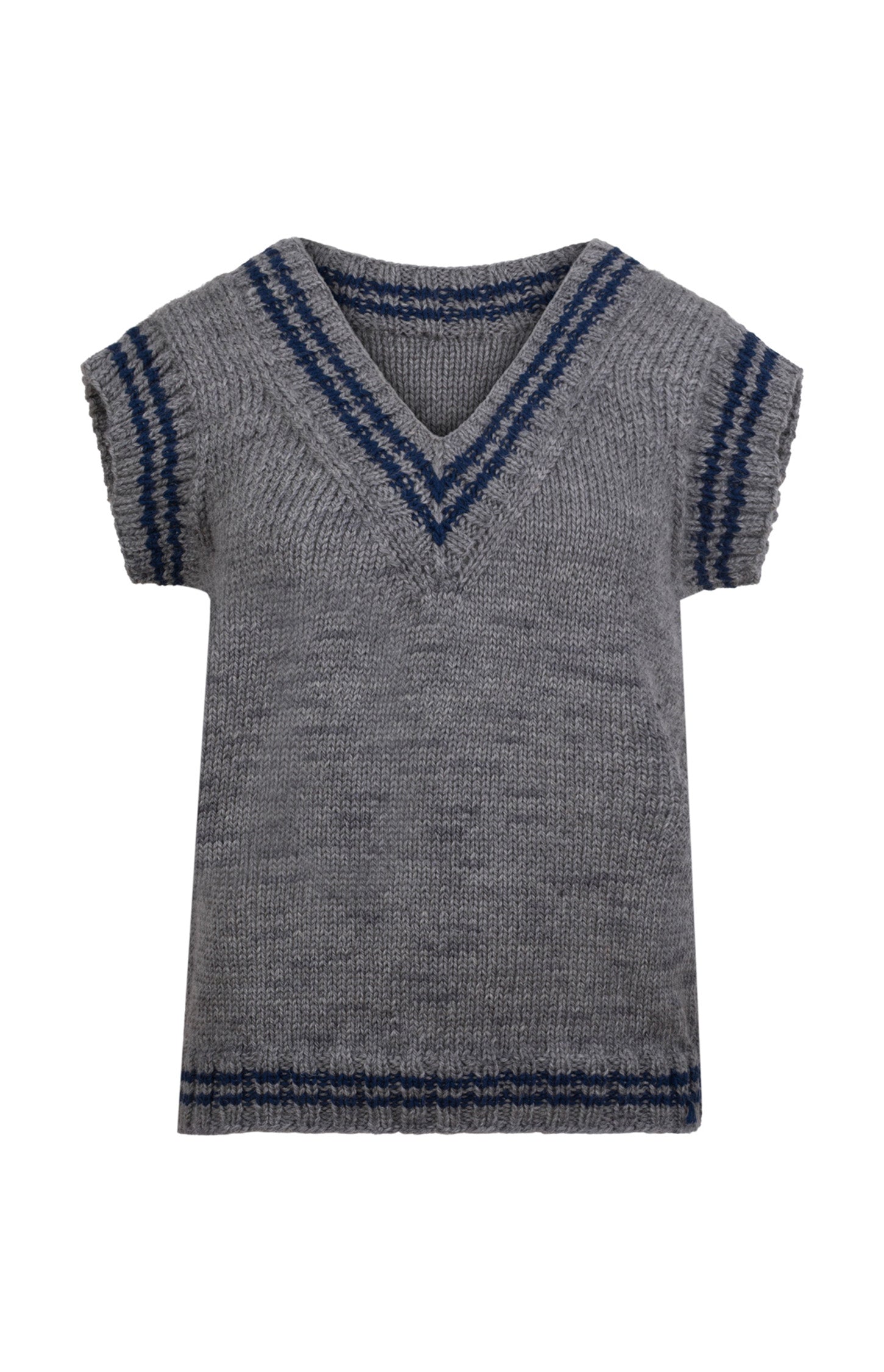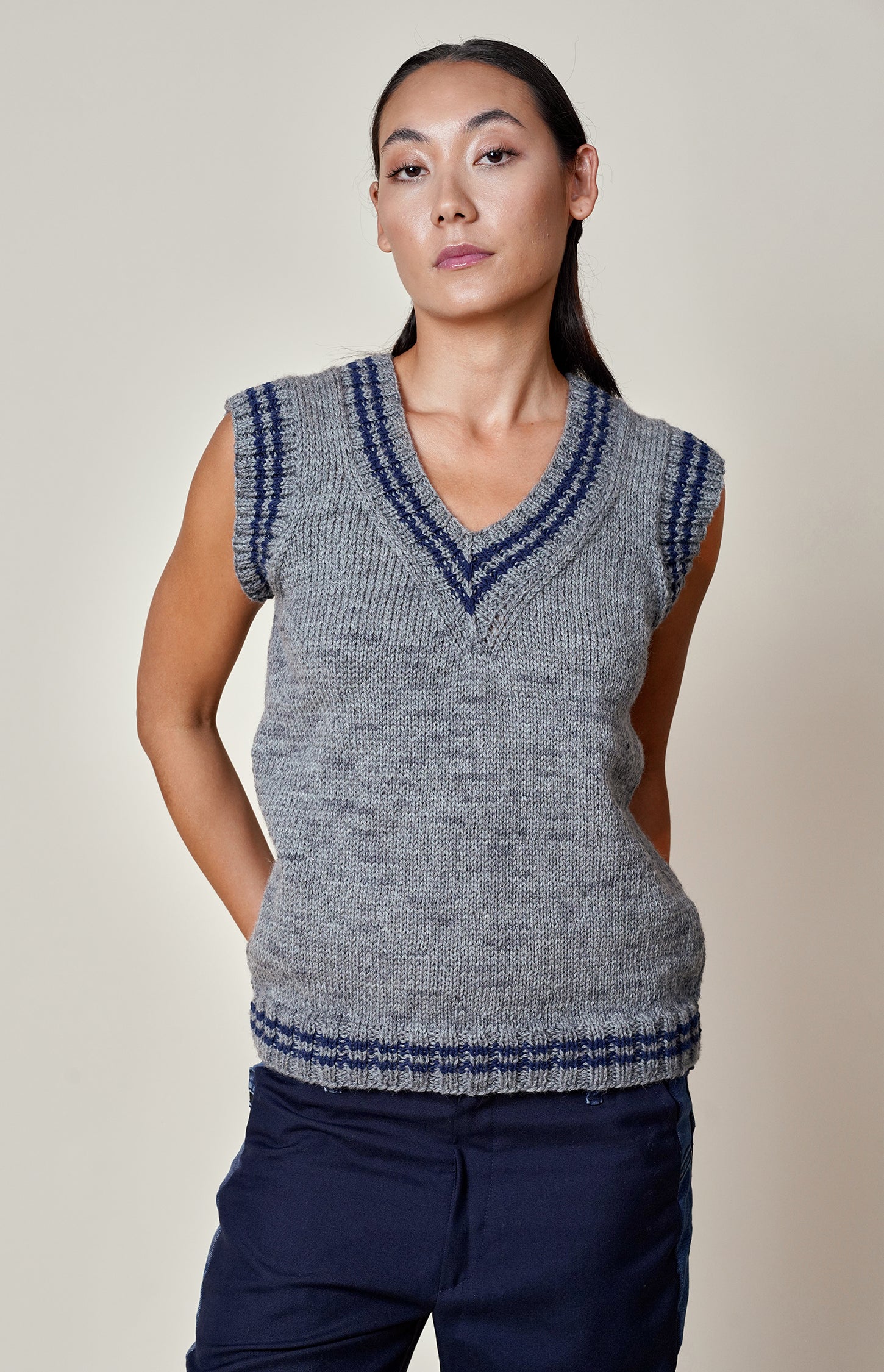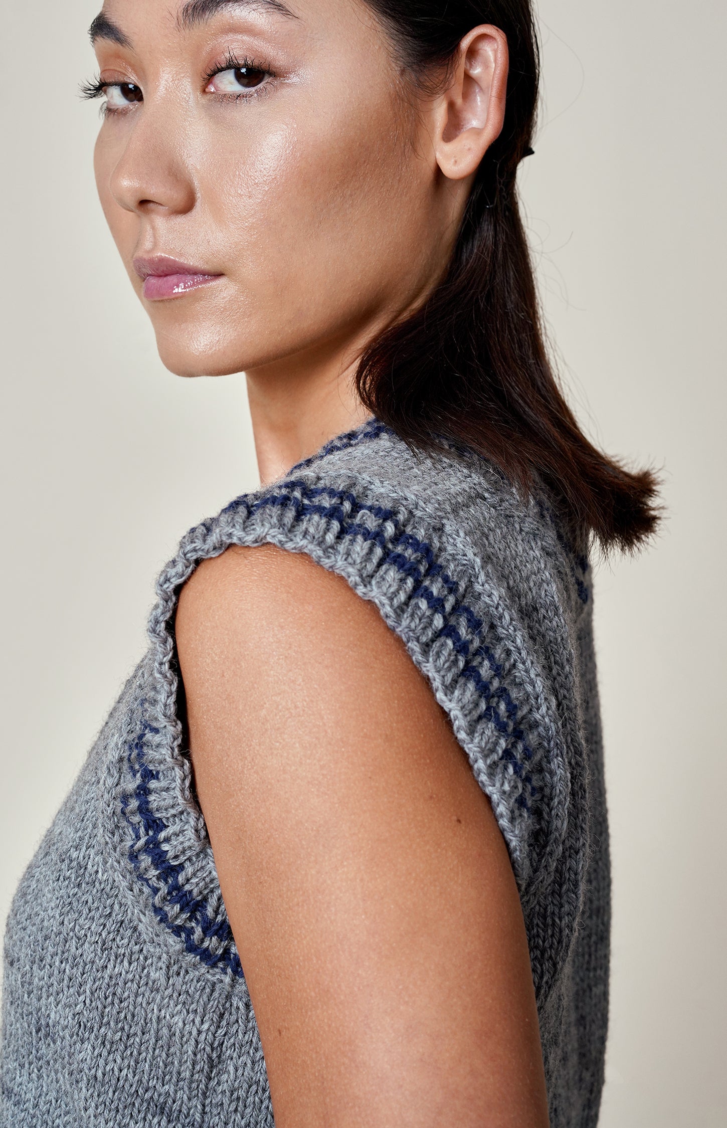 Our grey wool vest is a contemporary revival of a timeless classic. Crafted from recycled wool, this piece reimagines the traditional knit vest with a modern sensibility. Wide ribbing defines the hem, armholes, and V-neckline, lending both structure and understated detail.