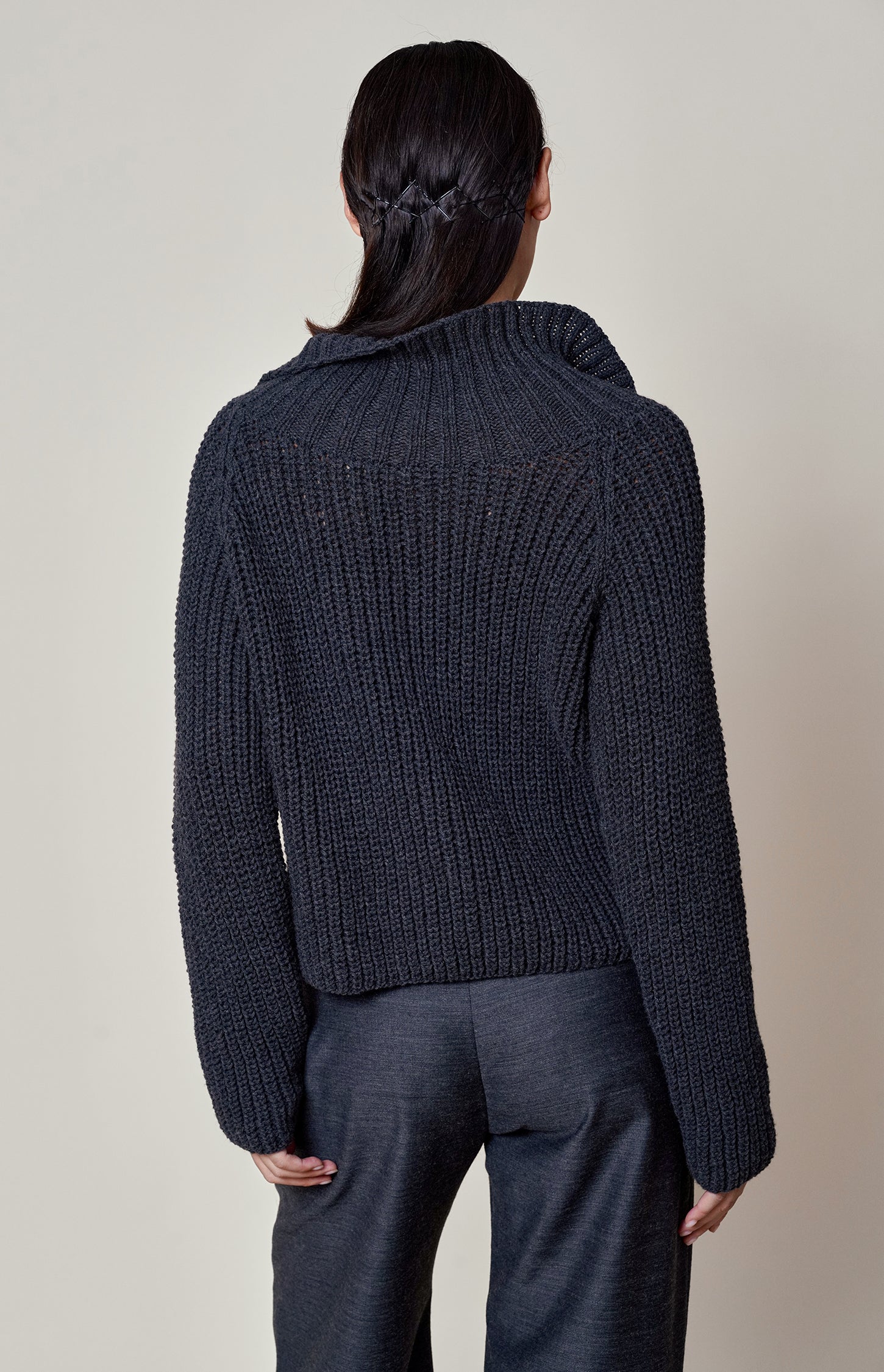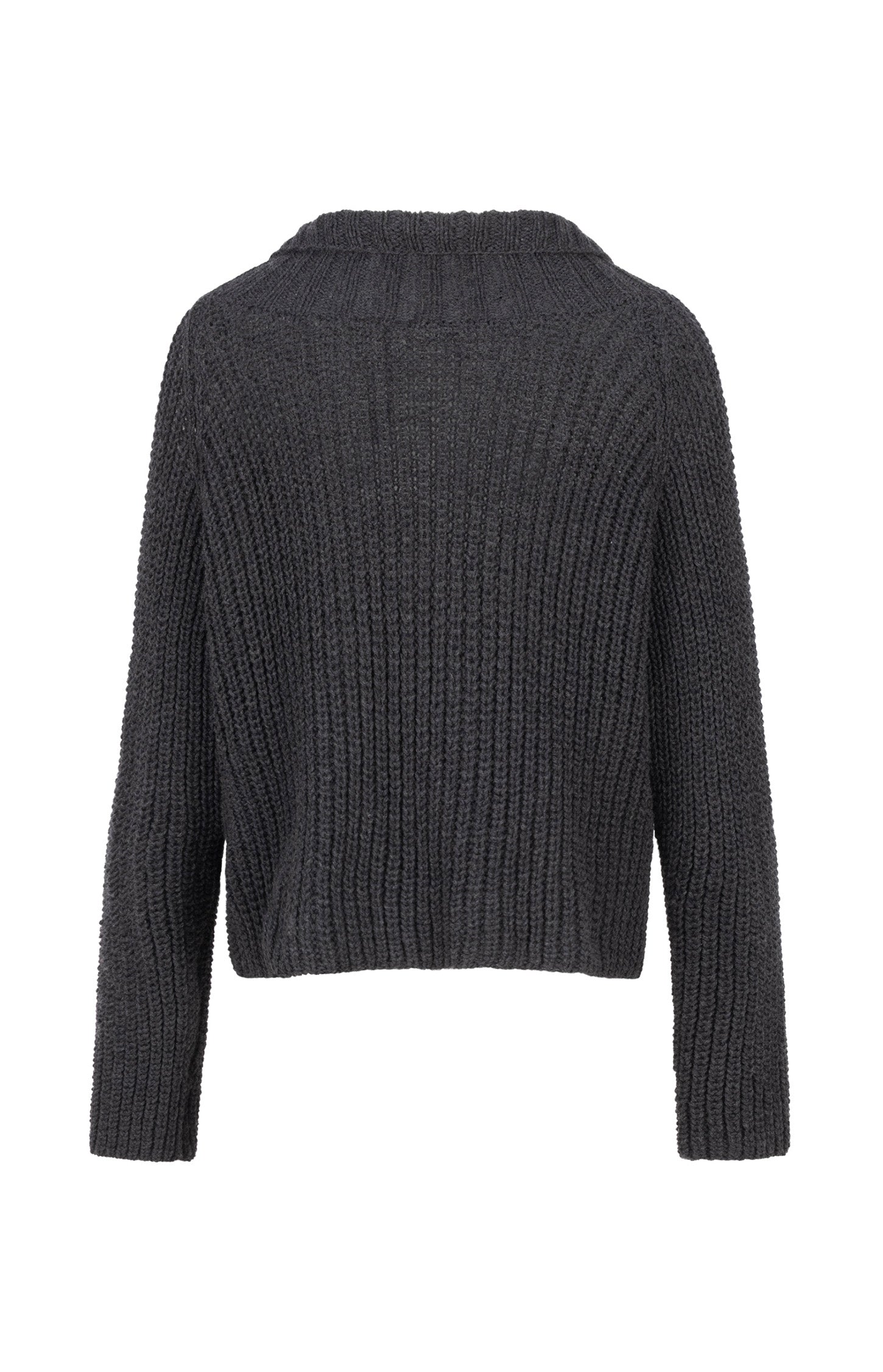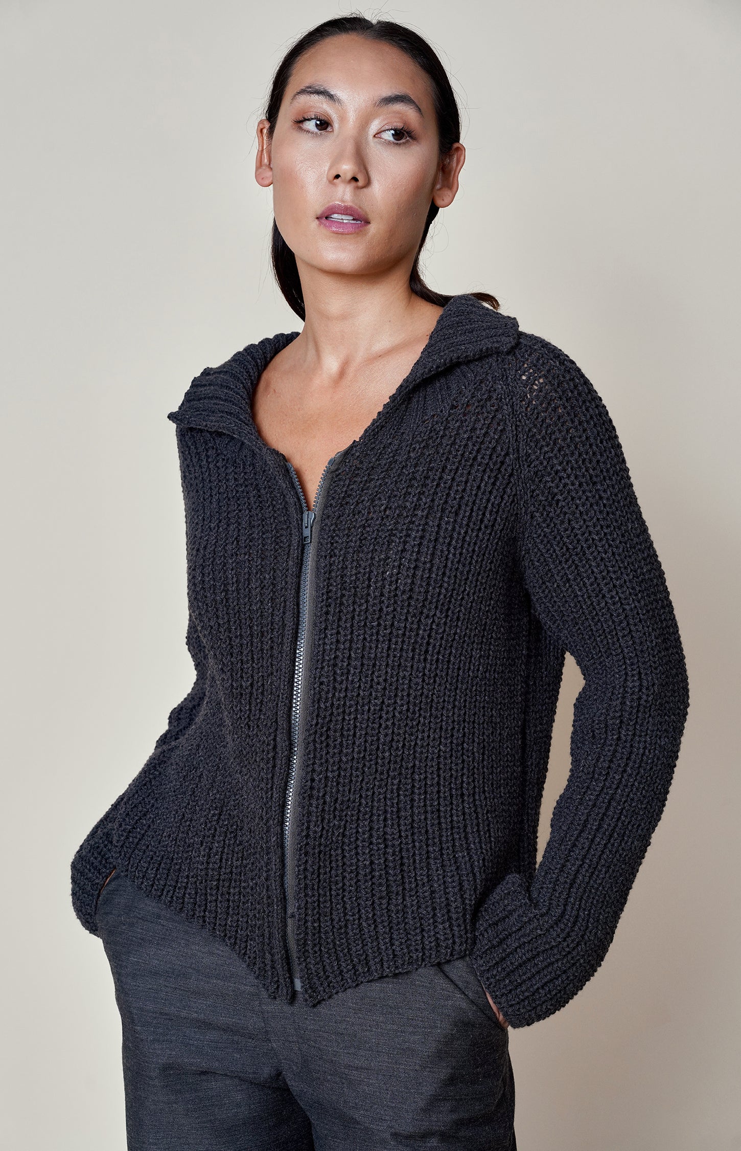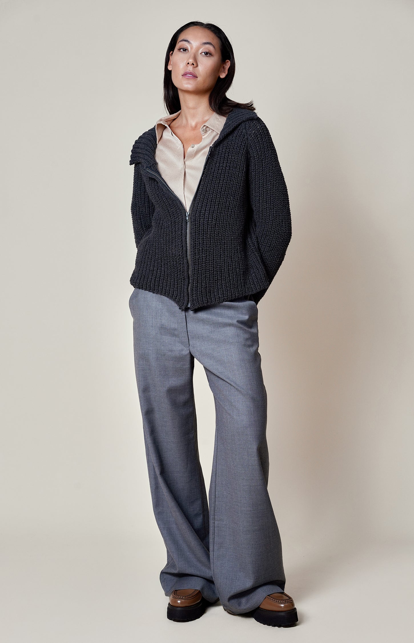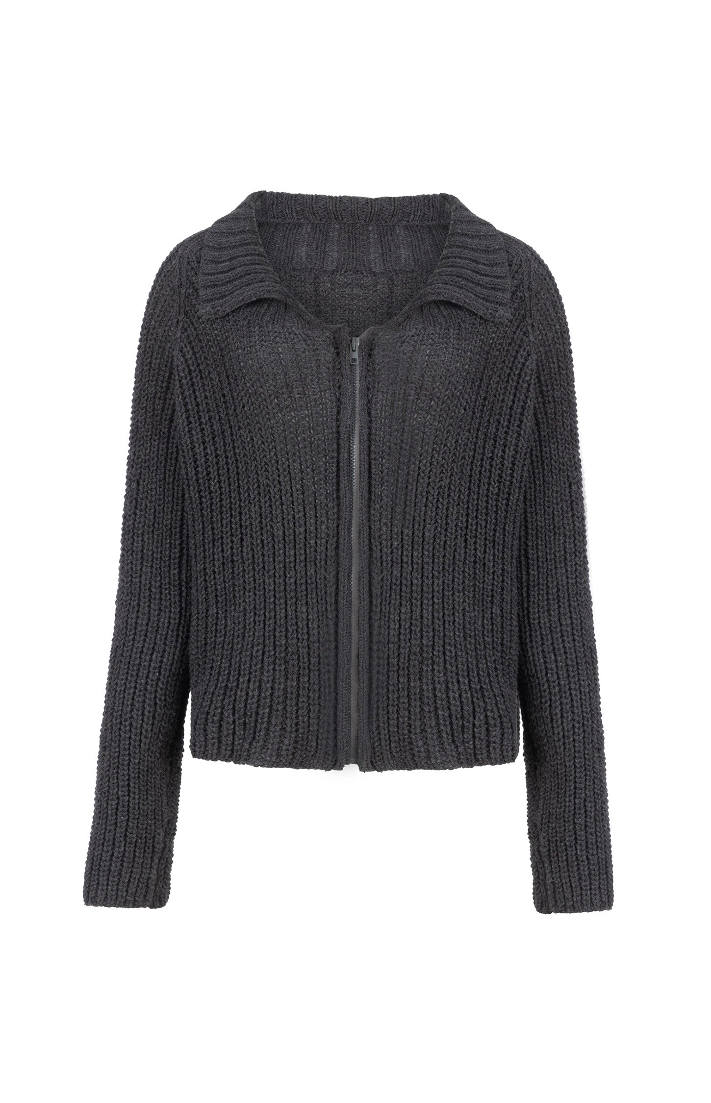 Our grey cashmere cardigan is crafted in luxurious rib stitch, featuring long sleeves, an extended collar, and a sleek zip fastening. Made to order and designed for layered winter styling, it combines warmth with effortless elegance, making it a versatile, timeless wardrobe essential.