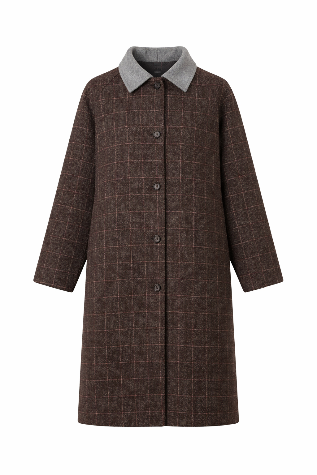Our brown checked wool coat is a modern reinterpretation of the classic menswear overcoat, crafted with precision and care. Designed with raglan sleeves for softly rounded shoulders and slanted pockets lined in soft viscose, it balances structured tailoring with effortless ease.