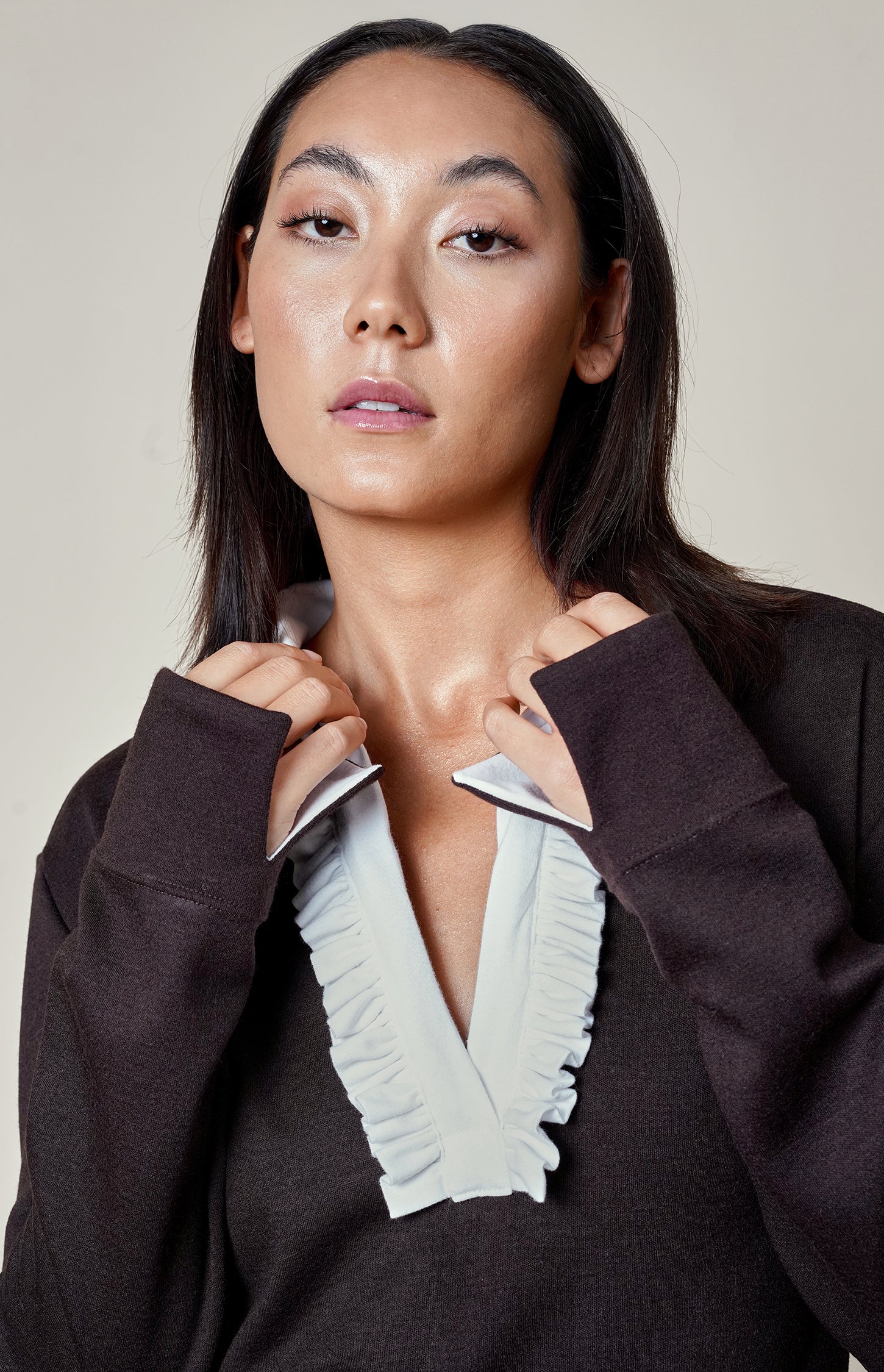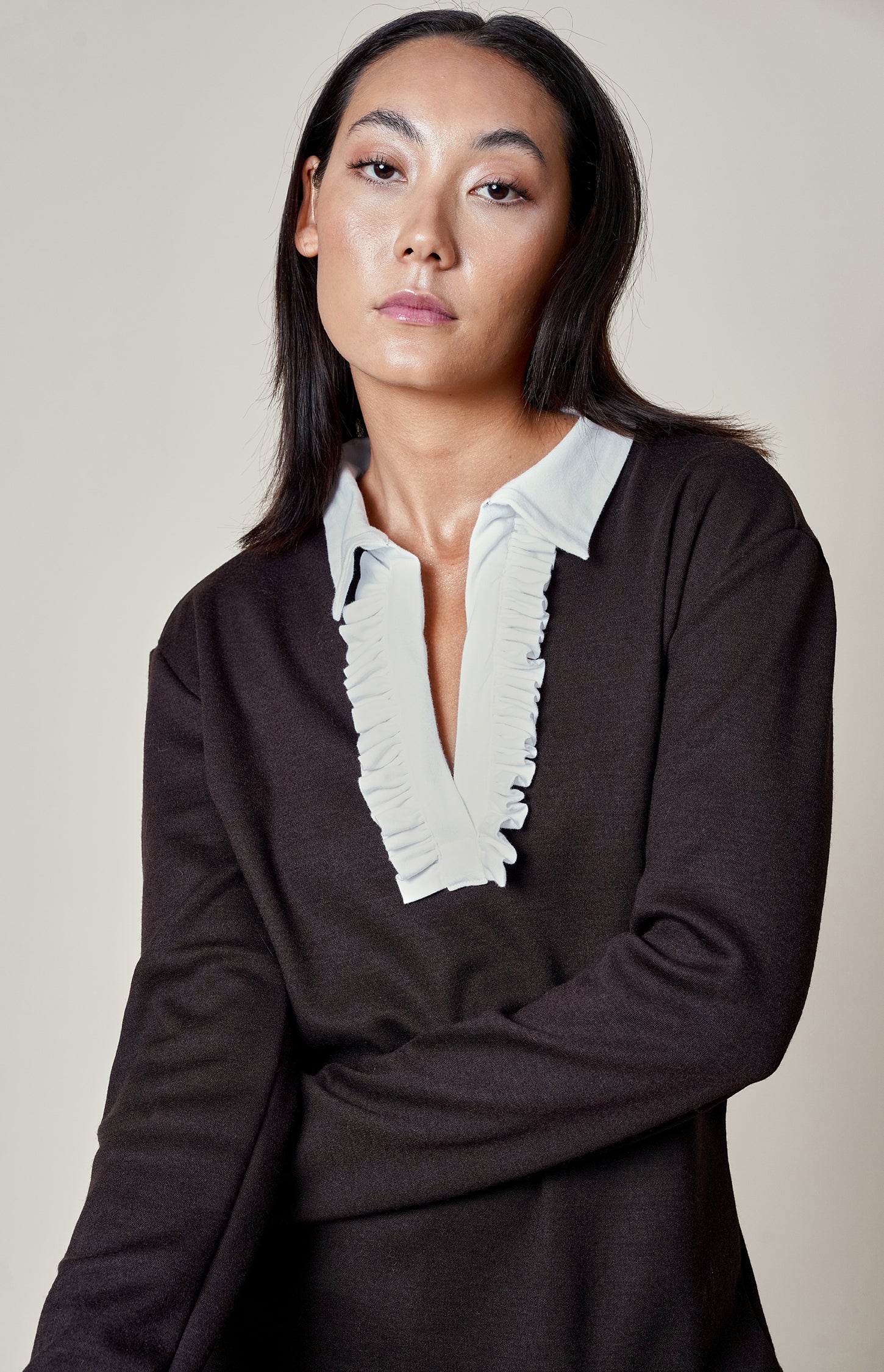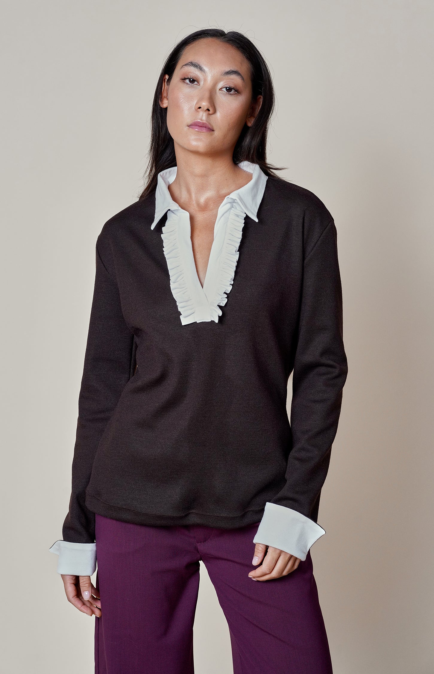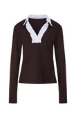 Our hot chocolate polo shirt is crafted from the softest cotton jersey for luxurious comfort and a refined fit. Featuring a crisp white cotton button band with delicate frills and inner cuffs that reveal a bright contrast when turned up, it offers a feminine take on a classic silhouette. Elegant yet effortless, it is a versatile addition to the modern wardrobe.