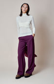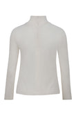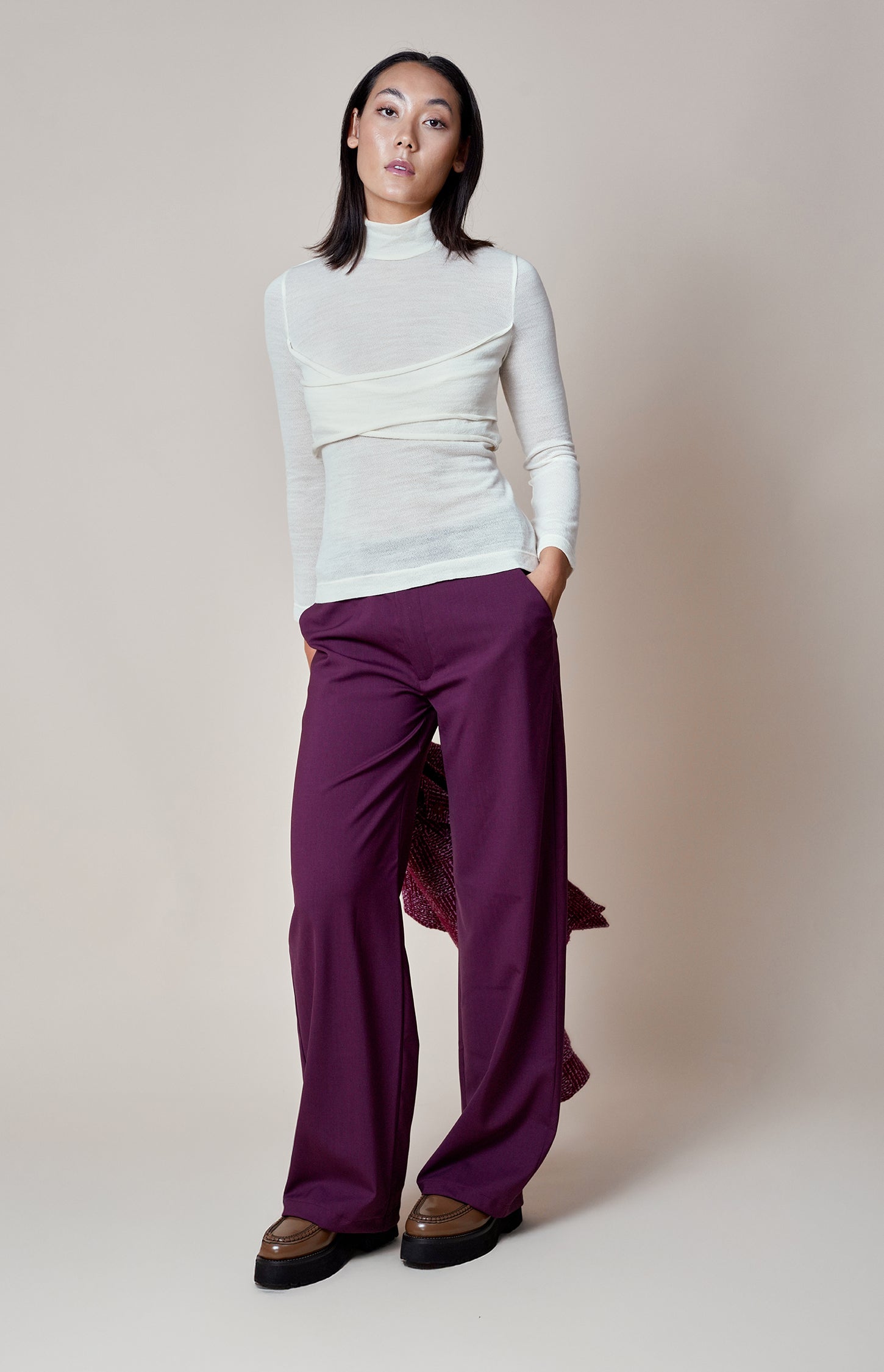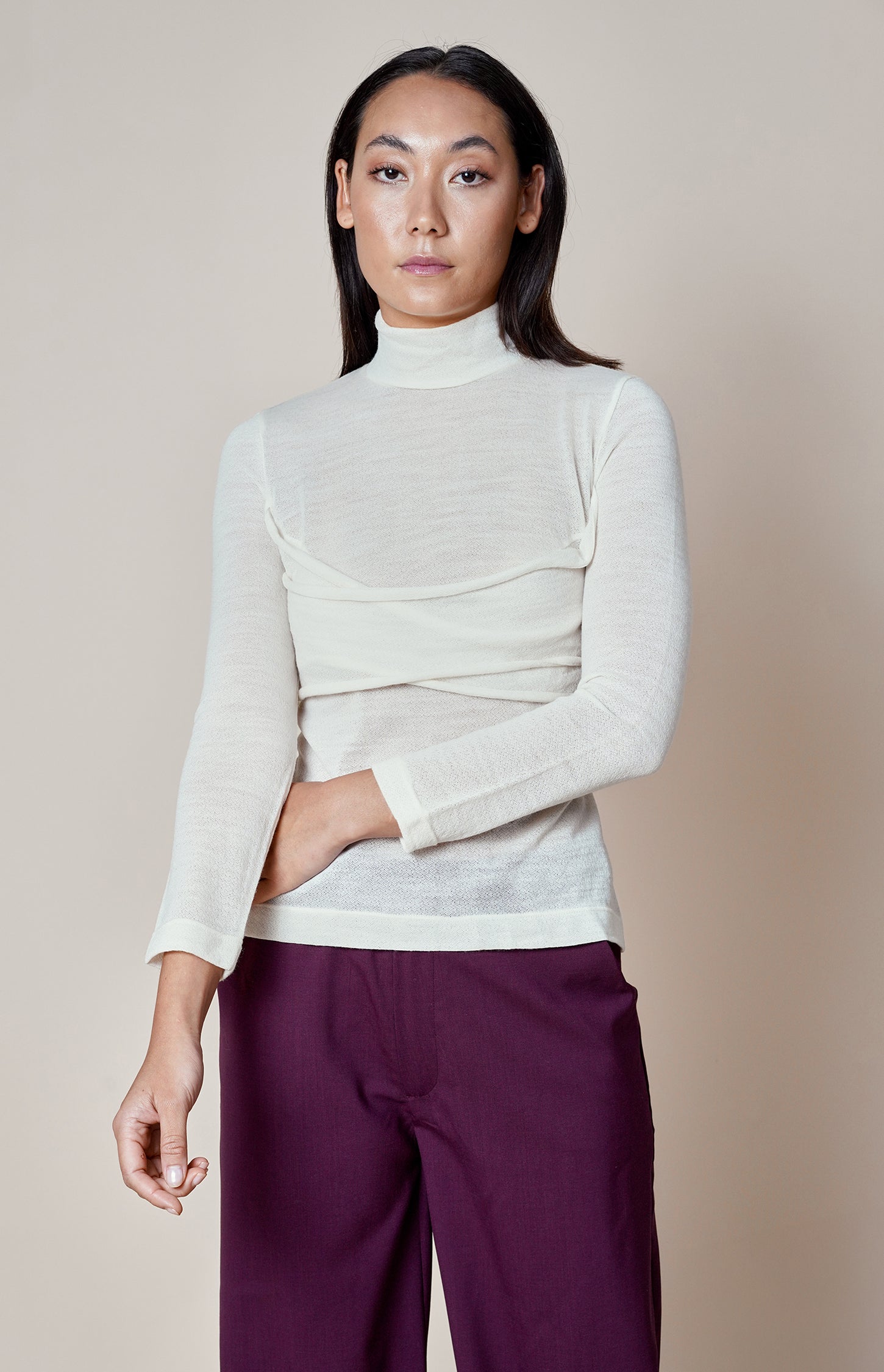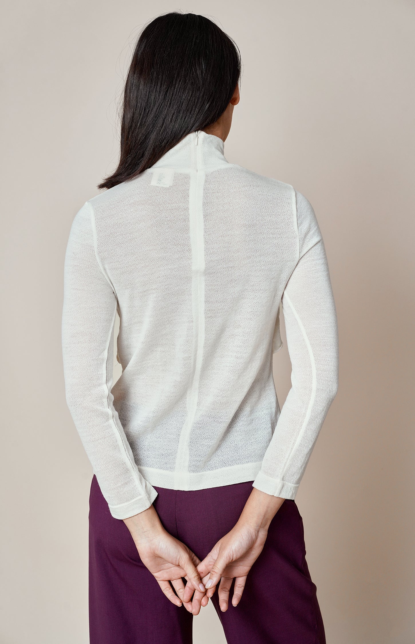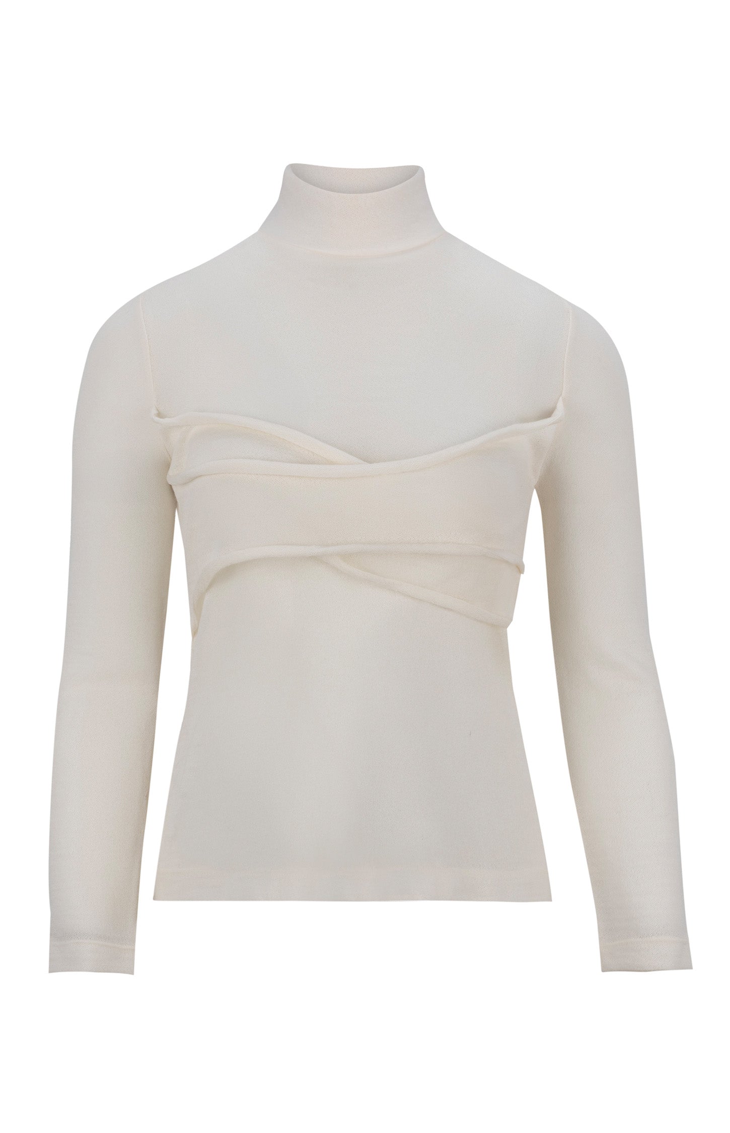 Our cream merino turtle-neck mock wrap top is crafted from soft, cozy jersey with an intricate knit for refined comfort. Featuring a discreet center-back zip, it offers versatile styling—wear alone or layered for effortless elegance. Made-to-order, this piece balances sophistication and comfort, making it a wardrobe essential.