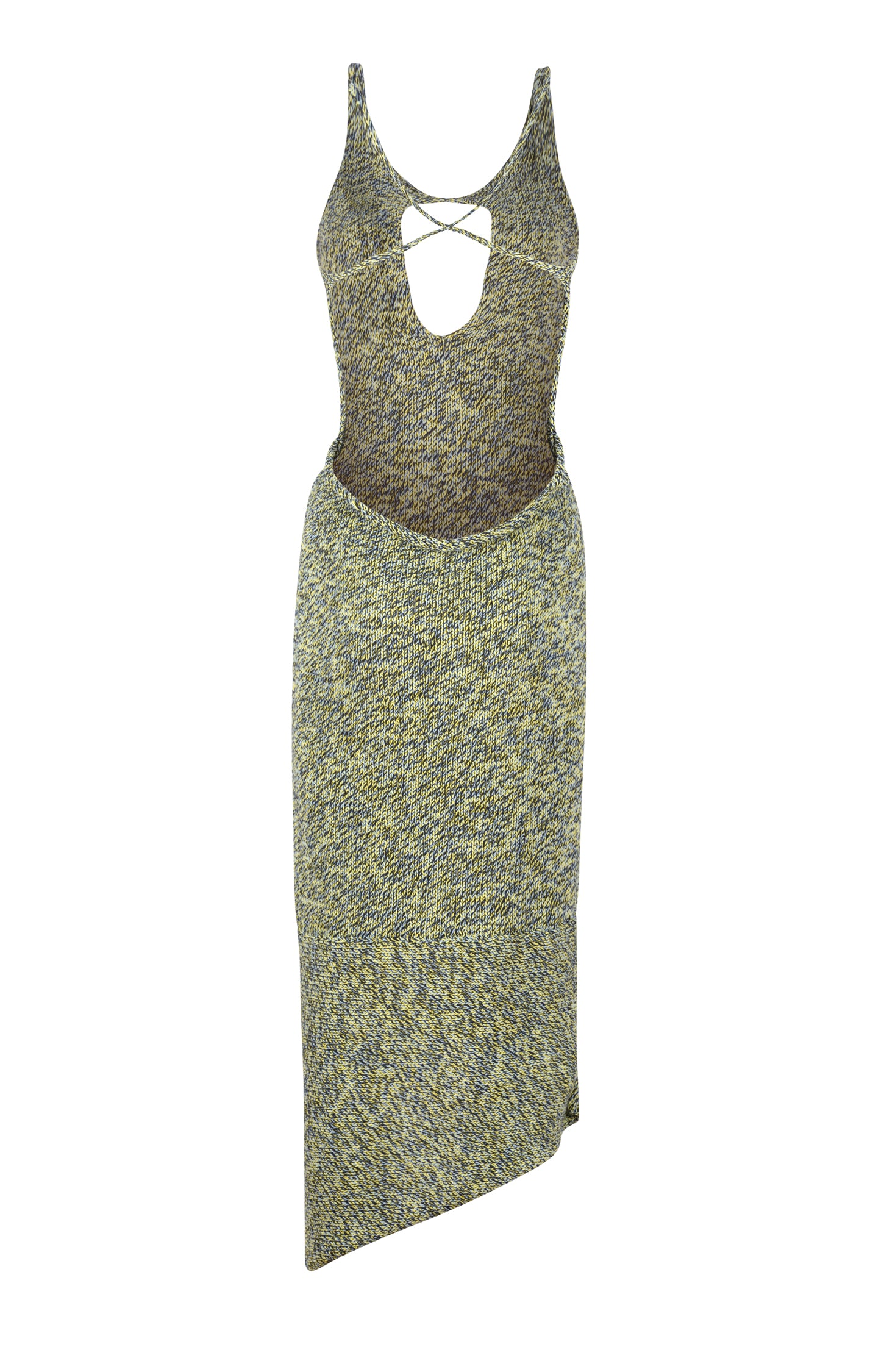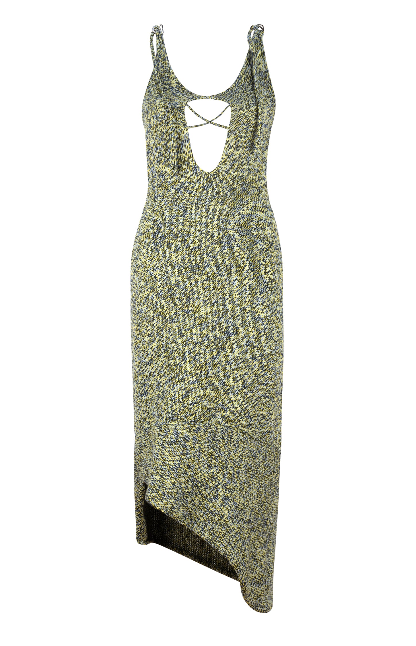 Introducing our striking multicolored cotton knit dress, a perfect blend of effortless style and modern elegance. Designed with delicate adjustable straps and a daring open back, this piece embraces a sleek, body-skimming silhouette. The asymmetrical hemline adds movement, while the bold navy, yellow, and light blue hues create a dynamic, eye-catching look.