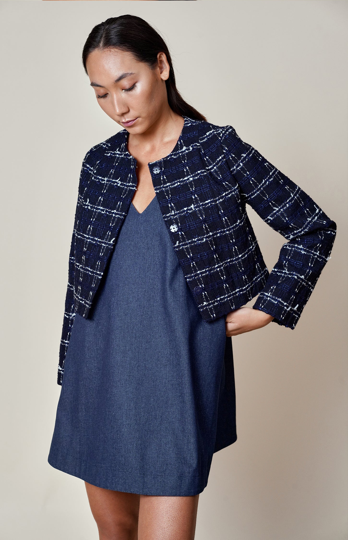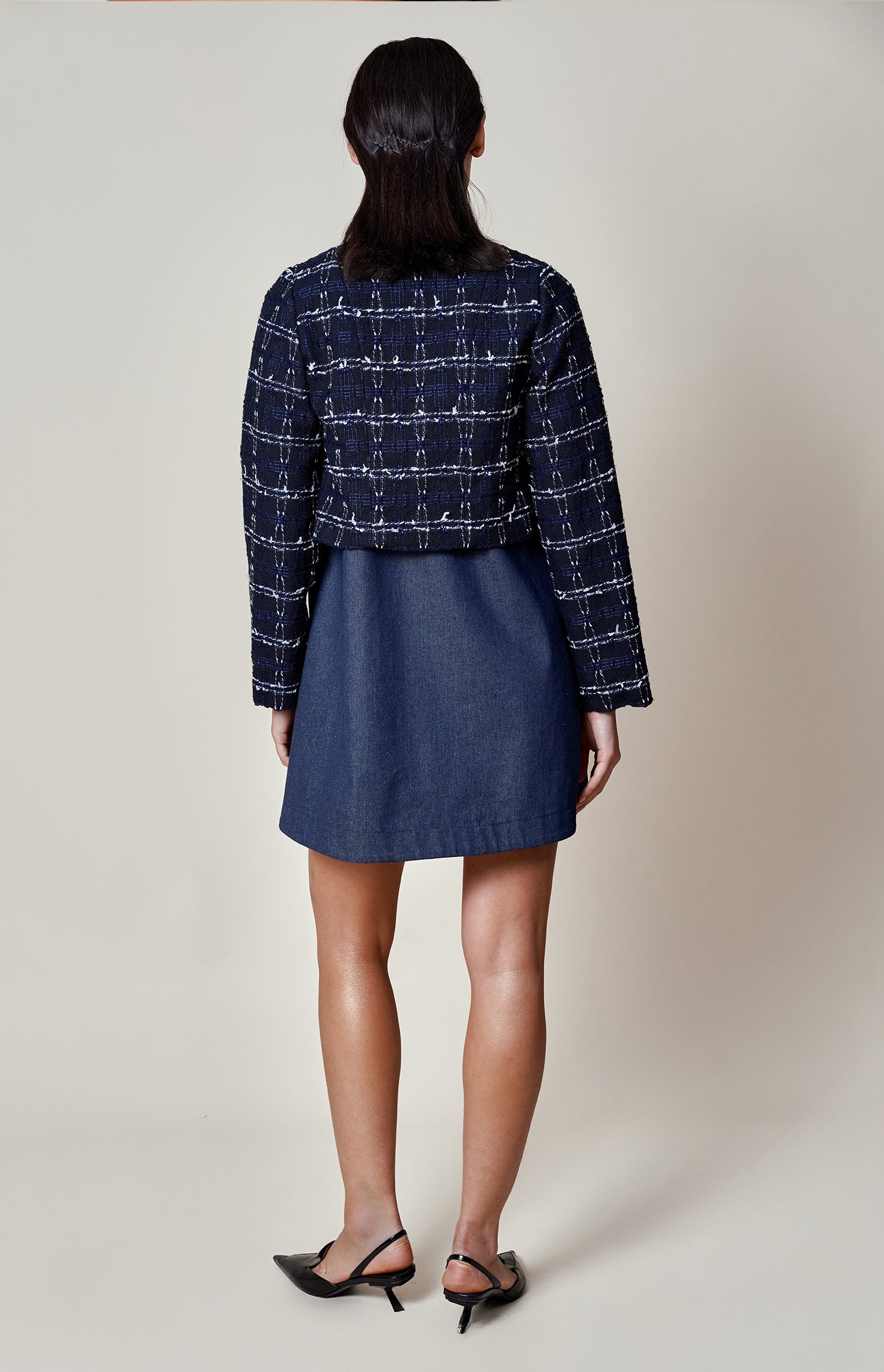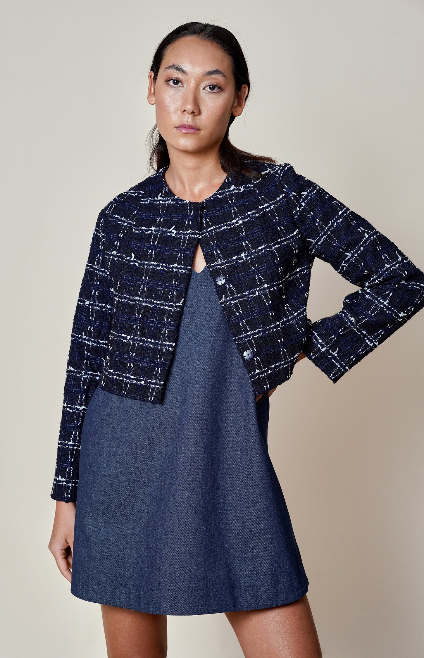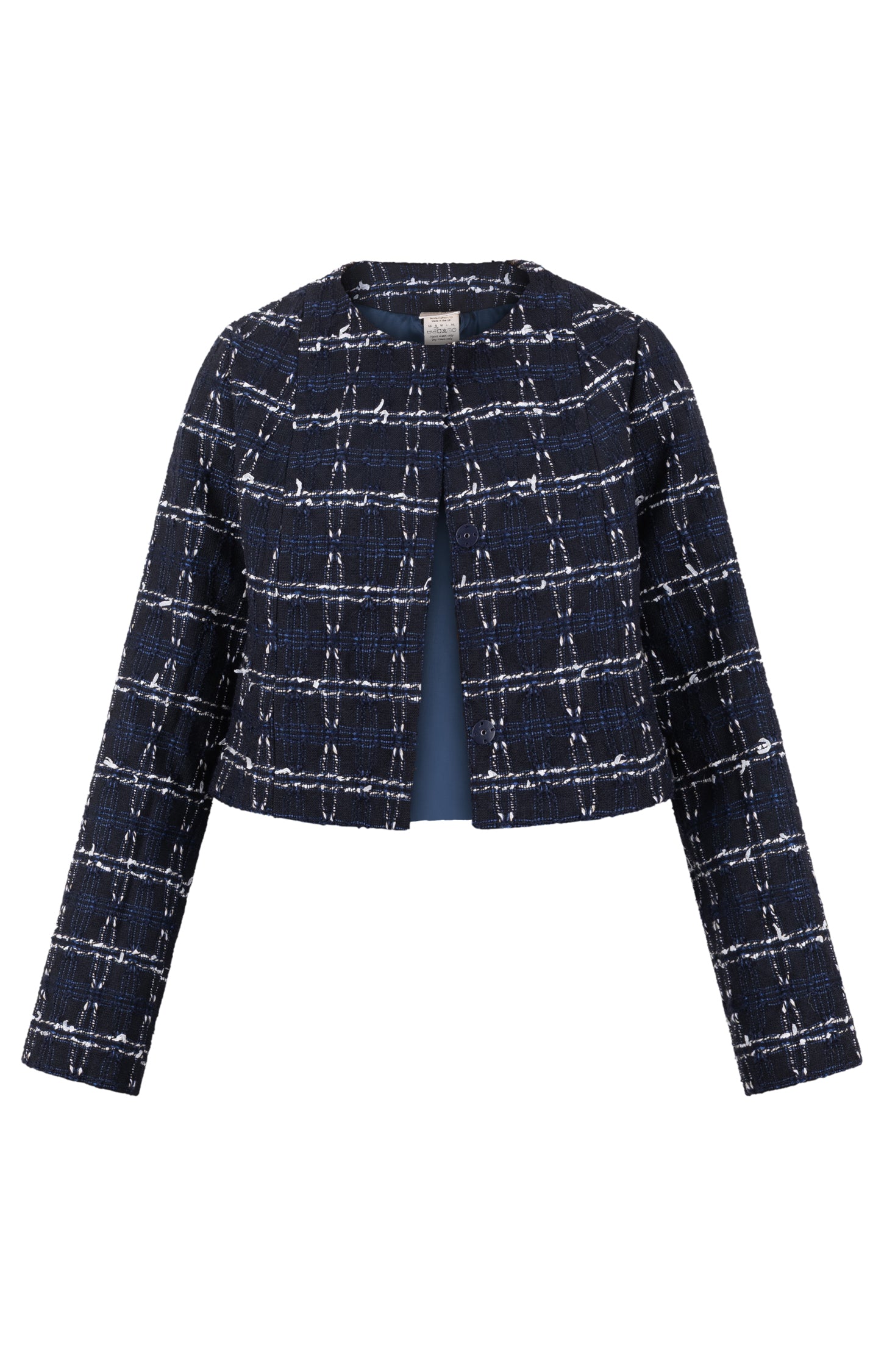 Our tweed jacket embodies timeless elegance, meticulously tailored for a distinguished finish. Cut to the waist and fully lined in fluid viscose, it balances structure with ease, while long sleeves and a refined round neckline evoke a classic, understated silhouette.