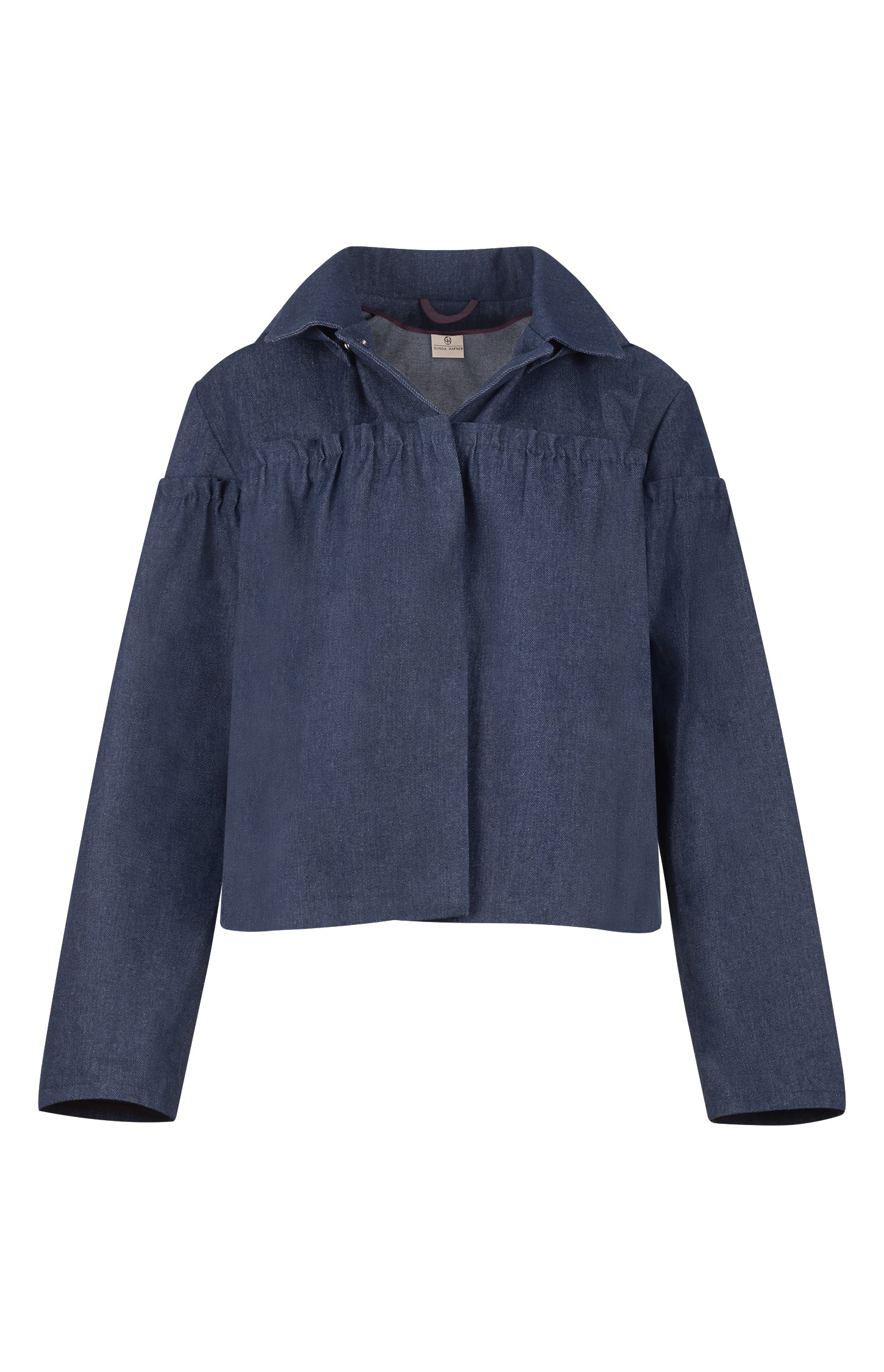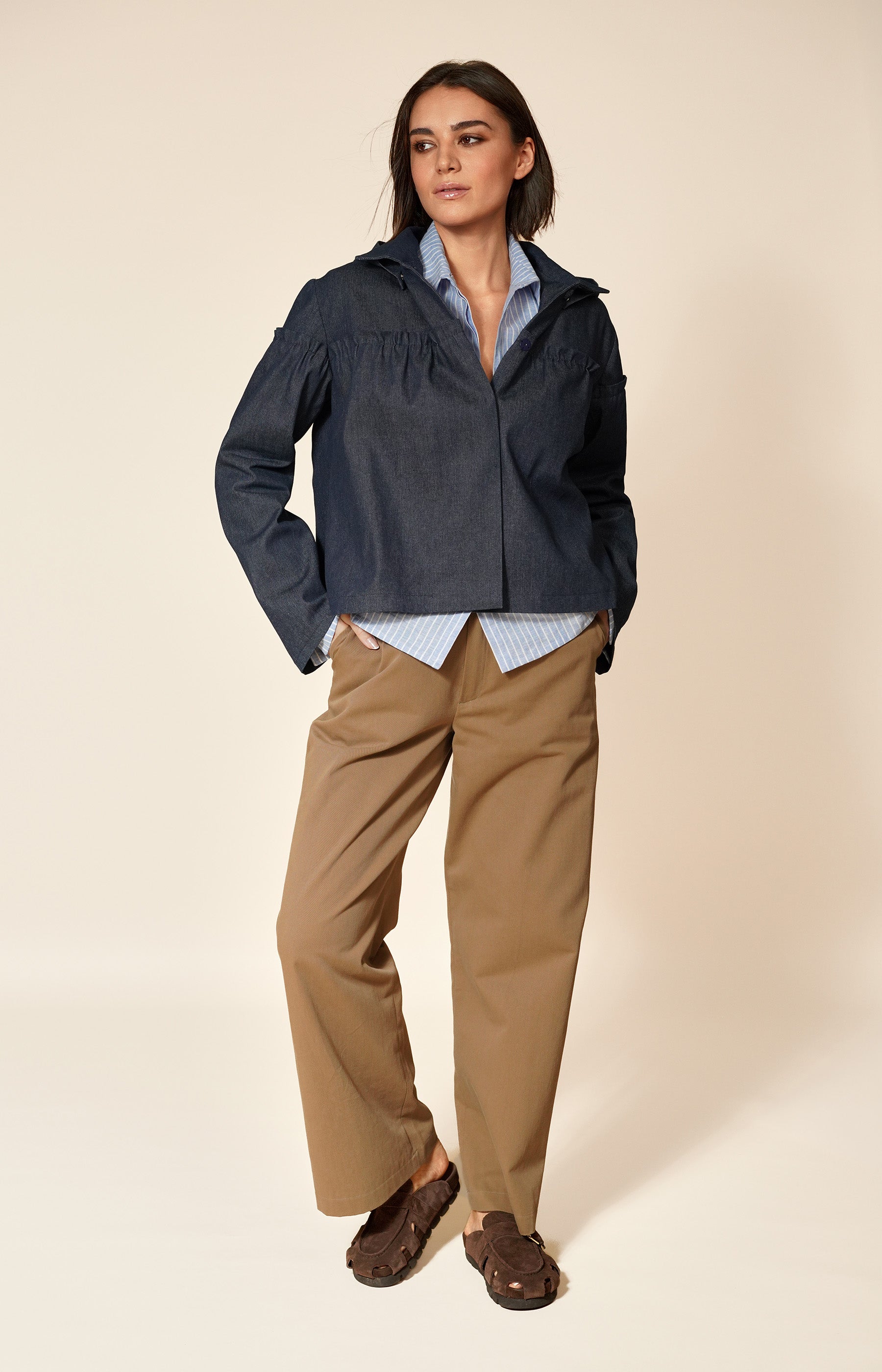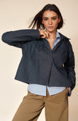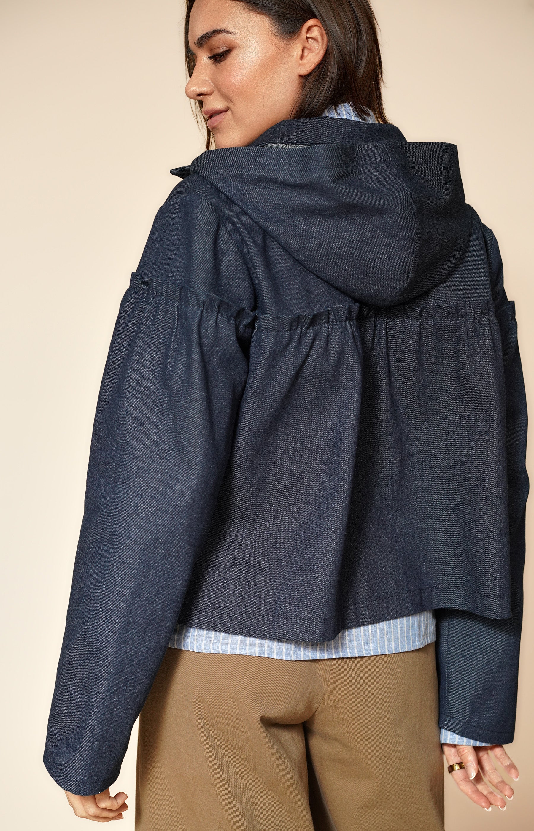 Polished yet practical, this navy cotton jacket is crafted from structured denim, delivering the perfect balance of durability and comfort. Cut to the hips for a flattering shape, it features softly ruched detailing along the sleeves and body, adding subtle texture and modern dimension to its silhouette.