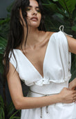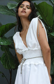 Featuring seersucker fabric and detailing to the shoulders, this dress is sure to make an impact. Cord to straps and waistline nod to Greek influences. A generous shirring insert is on-trend and flattering. Made using organic cotton sourced from our UK supplier, this dress is breathable and light- perfect for any summer getaway.