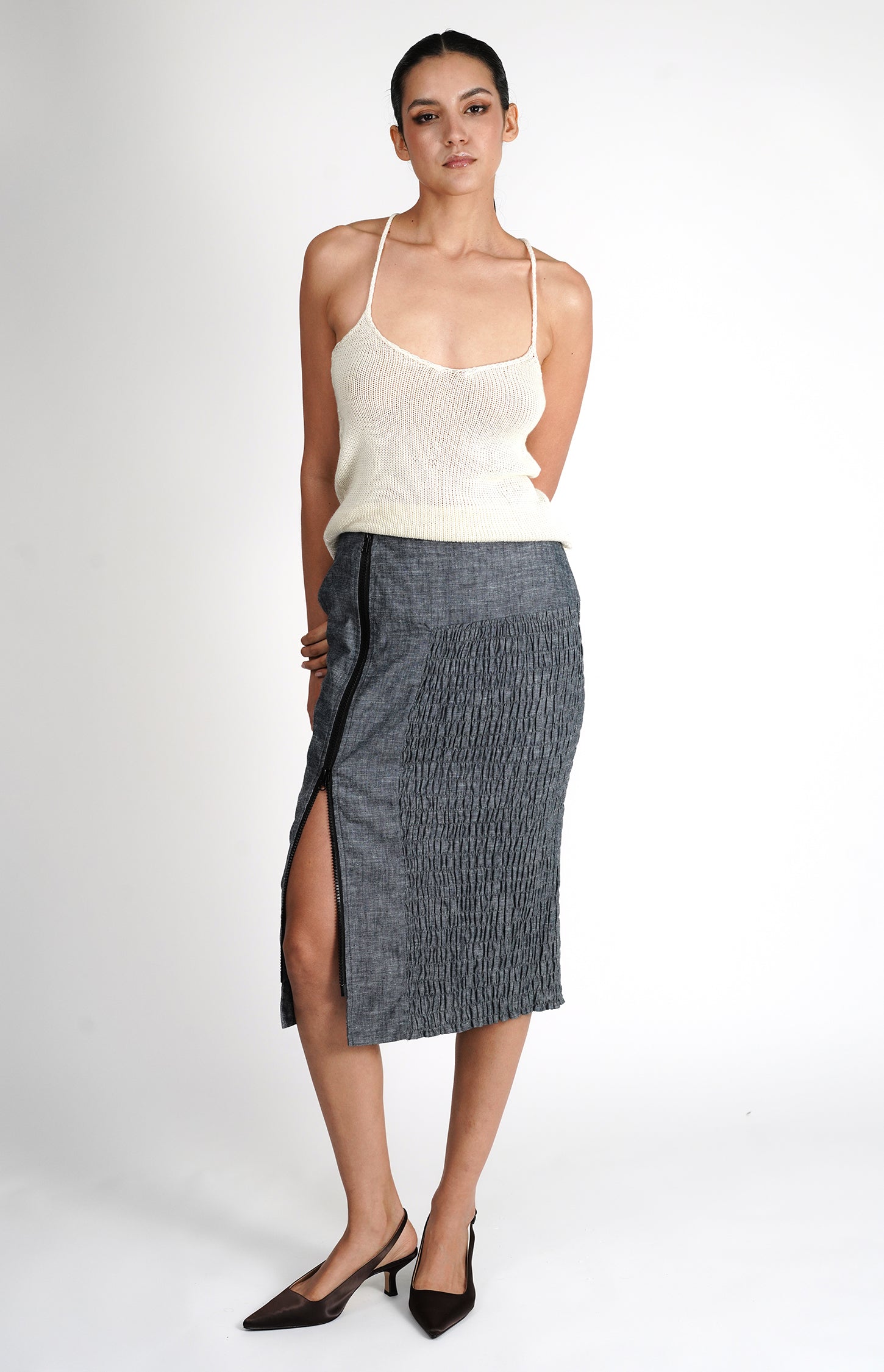 Introducing our Cream Asymmetric Sheer Knit Top, a sleek and contemporary piece designed with modern elegance in mind. Crafted from soft cotton, this sleeveless top features long ribbing in the front and back, adding subtle texture and structure. The asymmetric hem creates a unique, dynamic look, while the sheer knit fabric offers a light, airy feel. Long ribbed cuffs complete the design, enhancing its refined silhouette.