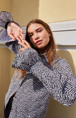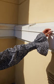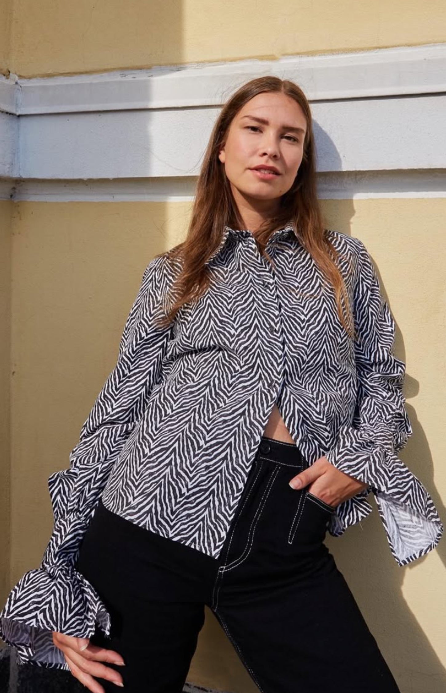 Elevate your wardrobe with our zebra print cotton fabric shirt. Featuring long ruffles at the sleeves and decorative black net buttons, this shirt boasts a loose cut for effortless style and comfort.